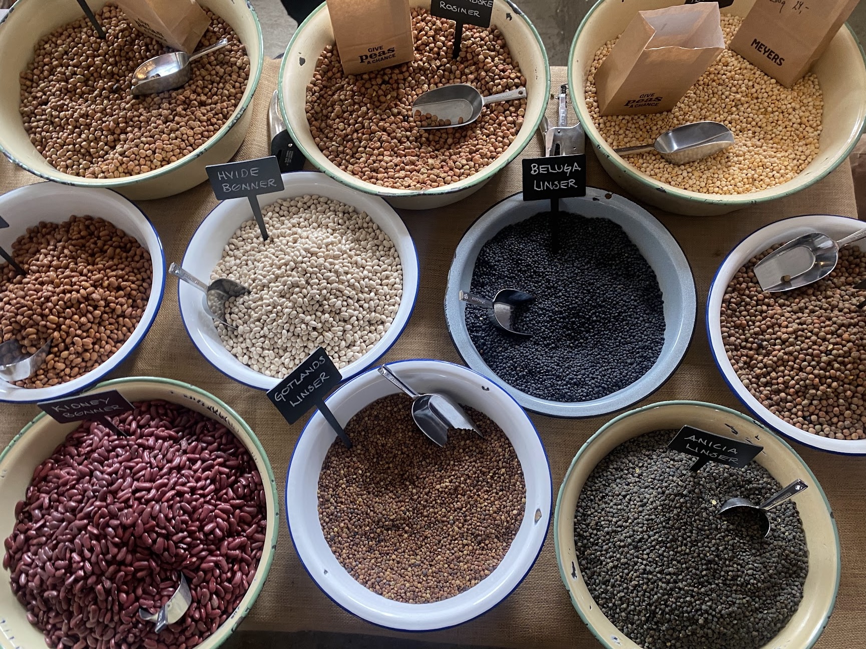 - Bælgfrugtboderne forhandler bl.a. de bevaringsværdige gråærtesorter Brun Ært fra Nakskov og Lollandske Rosiner, men også bornholmske belugalinser, Siriusærter fra Nordvestsjælland og Gotlandslinser dyrket tæt på Mariager. I boderne findes postkort med opskrifter, QR-koder med link til inspiration og mulighed for at vinde madkurser i Meyers Madhus.