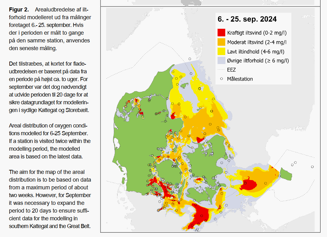 Det historiske iltsvind i september 2024 har en større udstrækning end i de seneste 22 år. Kort fra DCE-rapporten.