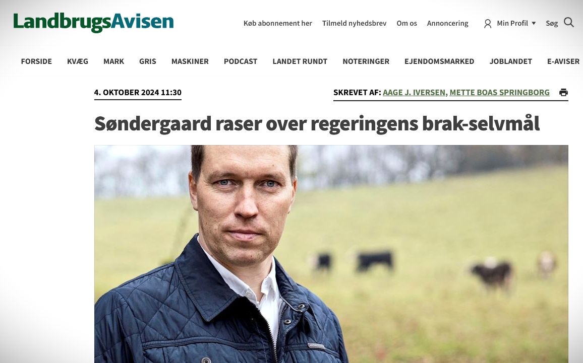 Derfor raser han mod den beskedne reduktion af kvælstofforbruget. Han siger nu (4/10) til landbrugsavisen: ”Hele grundtanken i treparten er, at når et areal ikke skal dyrkes længere, så skal det levere på både klima, vandmiljø og biodiversitet. Og det skal ske med intelligente, målrettede og lokale løsninger, der inddrager fagligheden hos de relevante lodsejere. I fuldstændig kontrast hertil står et centraliseret standardkrav på 4 pct. brak.”
