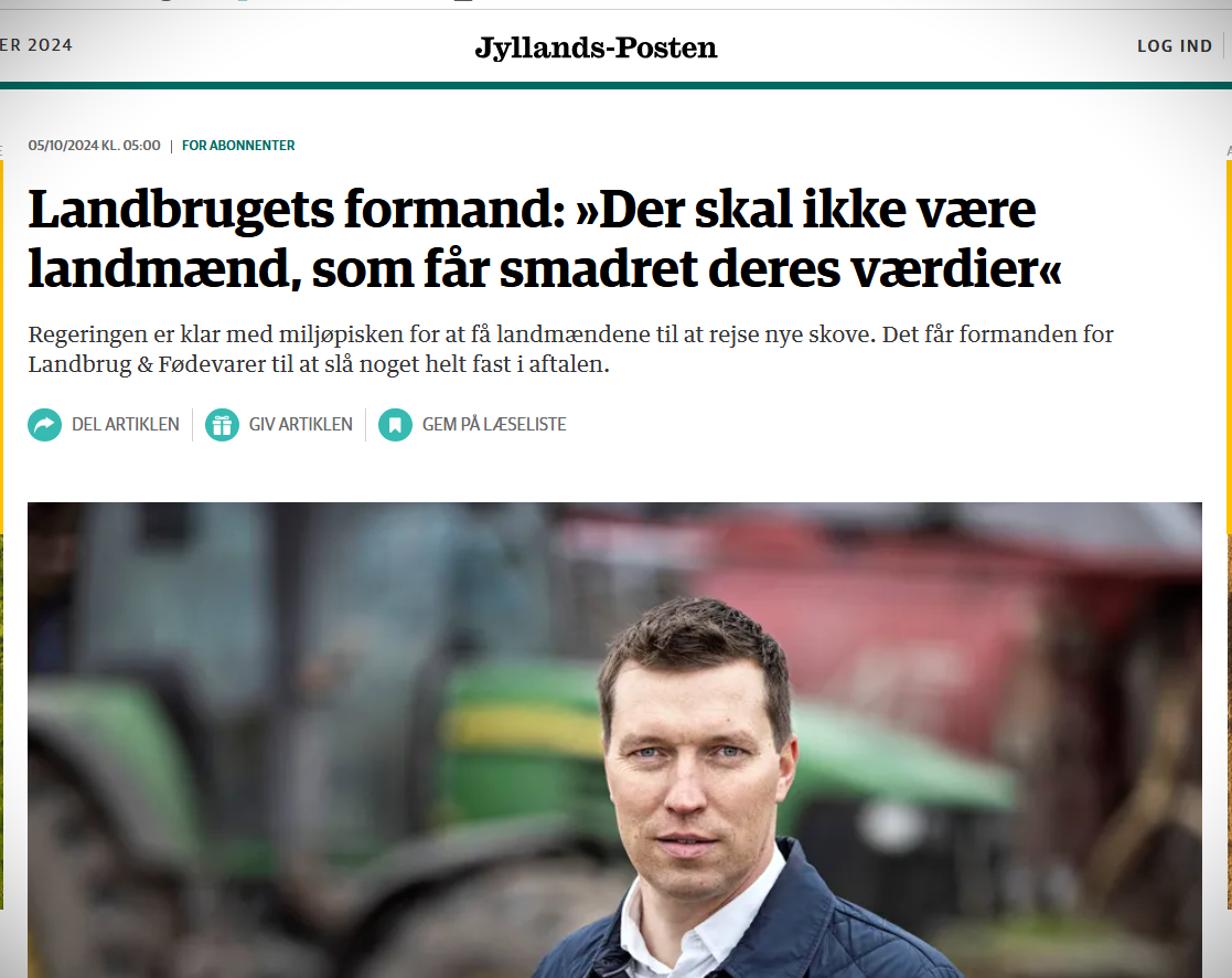 I et stort opslået interview 5. oktober i Jyllands-Posten kræver formanden, svinekødsproducent Søren Søndergaard, at regeringen finder yderligere 30 mia. kr. til landmændene, hvis de skal levere jord til de aftalte 250.000 hektar ny skov. Ellers bliver det uden Søndergaards medvirken, at trepartsaftalens skovrejsning gennemføres.