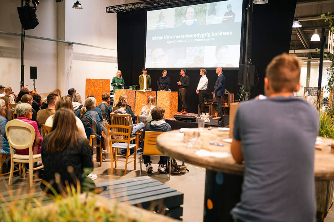 Gittemarie kalder det første panel op på scenen, og vigtigheden af at bringe bæredygtighed og grøn omstilling ind i virksomhederne, men i særdeleshed også ind i undervisningen, bliver hurtigt tydelig. Nana Holstein fra Tænketanken Mandag Morgen understreger, at vi står over for en reel mangel på grøn arbejdskraft. Uddannelsesinstitutionerne har et kæmpe ansvar, understreger hun. Det er her, de grønne kompetencer skal dyrkes, for uden dem kan vi ikke sikre den nødvendige omstilling.