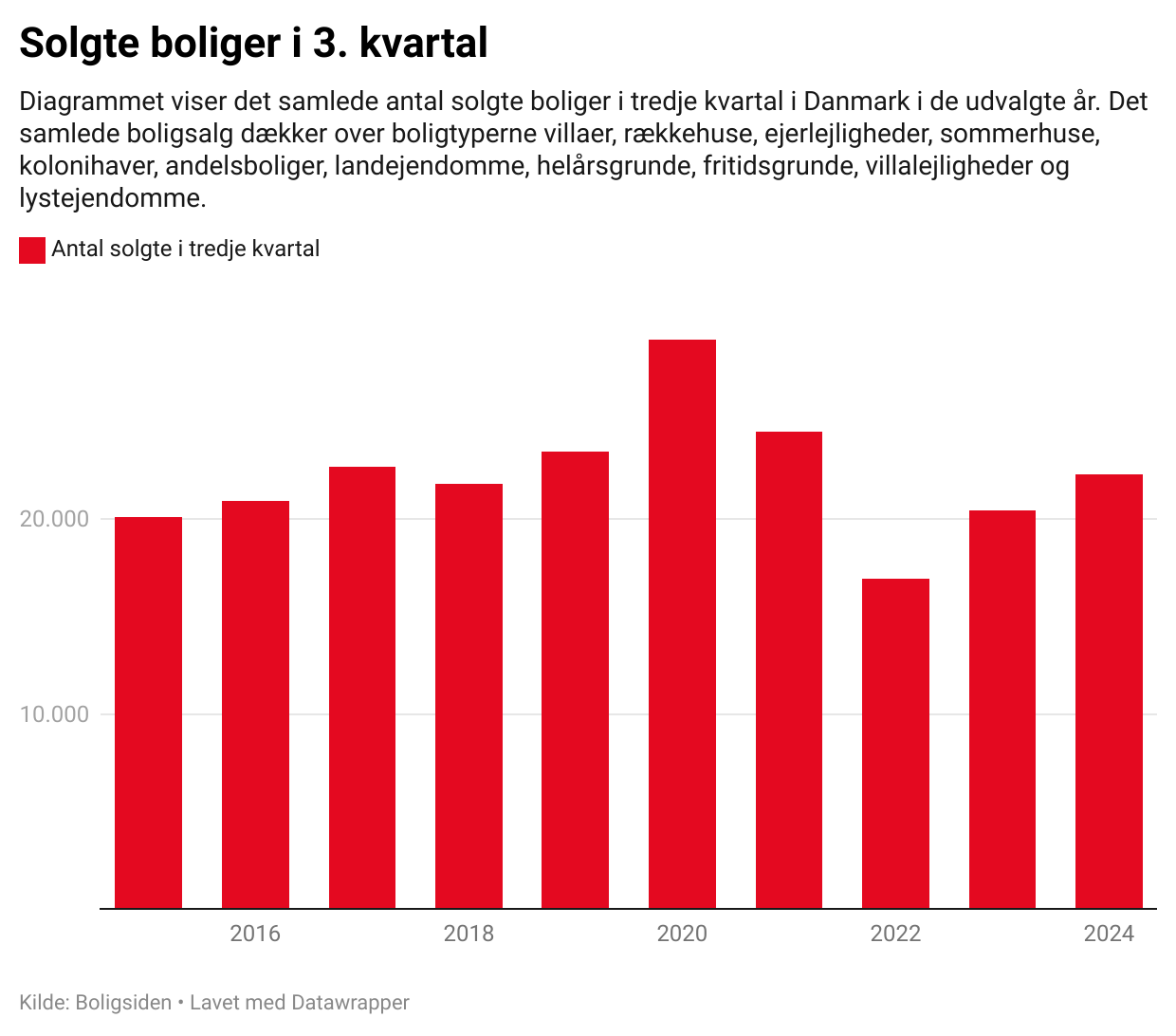 Der blev solgt 22.284 boliger samlet set i tredje kvartal af 2024, og det er et fald på 3,8 procent, når man sammenligner med andet kvartal i år. Det svarer til 885 færre solgte boliger på landsplan i perioden. Det viser nye handelstal fra Boligsiden.
