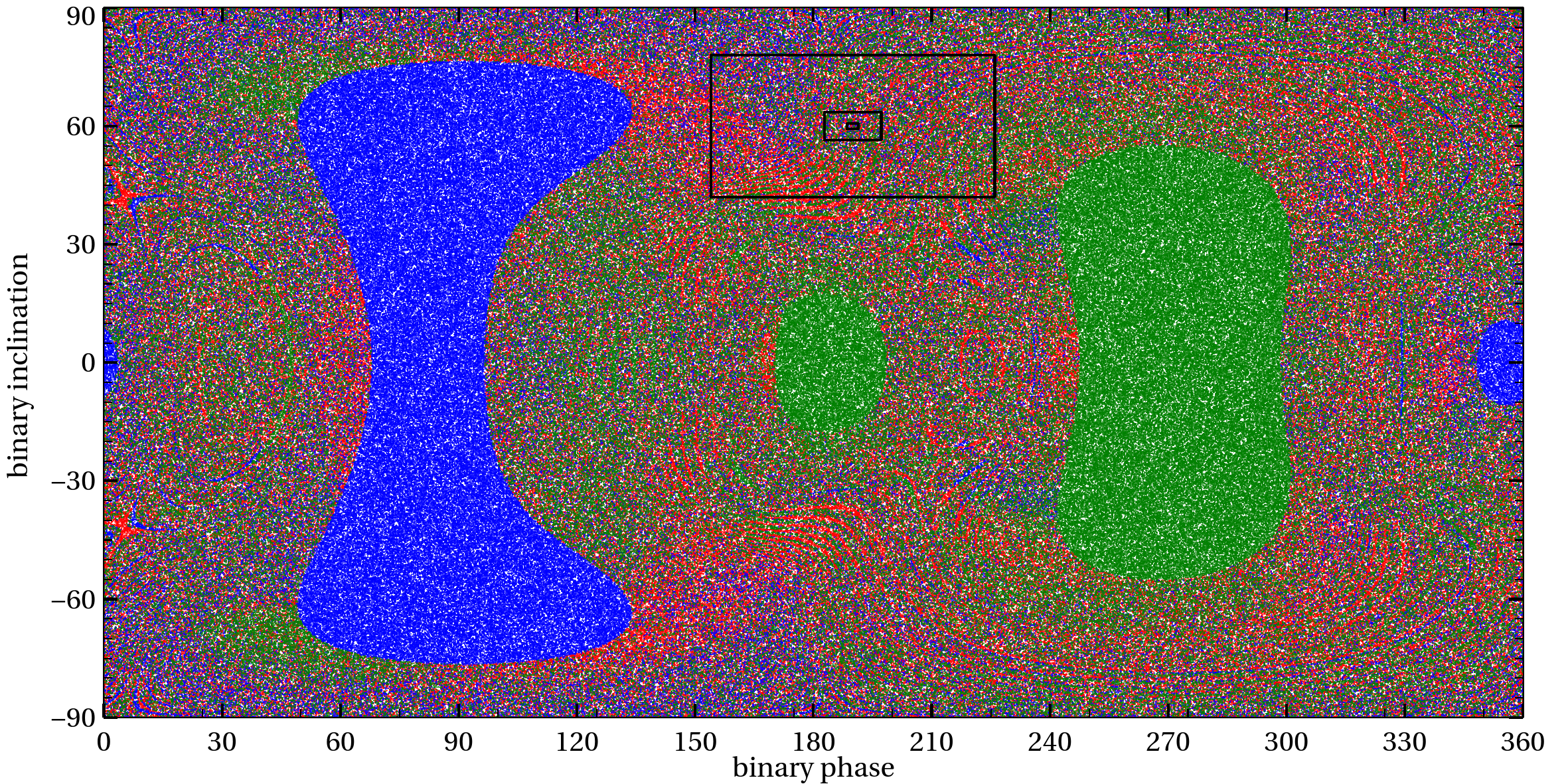 Udgangspunktet for simulationerne var placeringen af to af objekterne i deres fælles kredsløb – dvs. deres fase i en 360 graders akse. Dertil indgangsvinklen af det tredje objekt – med 90 graders variation.