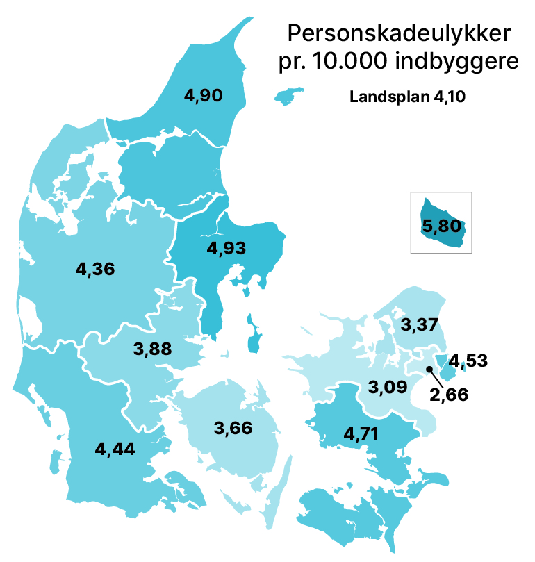 Nærmere bestemt var der sidste år 3,66 personskadeulykker pr. 10.000 indbyggere i Fyns Politikreds, mens der i Østjyllands Politikreds blev noteret 4,93.