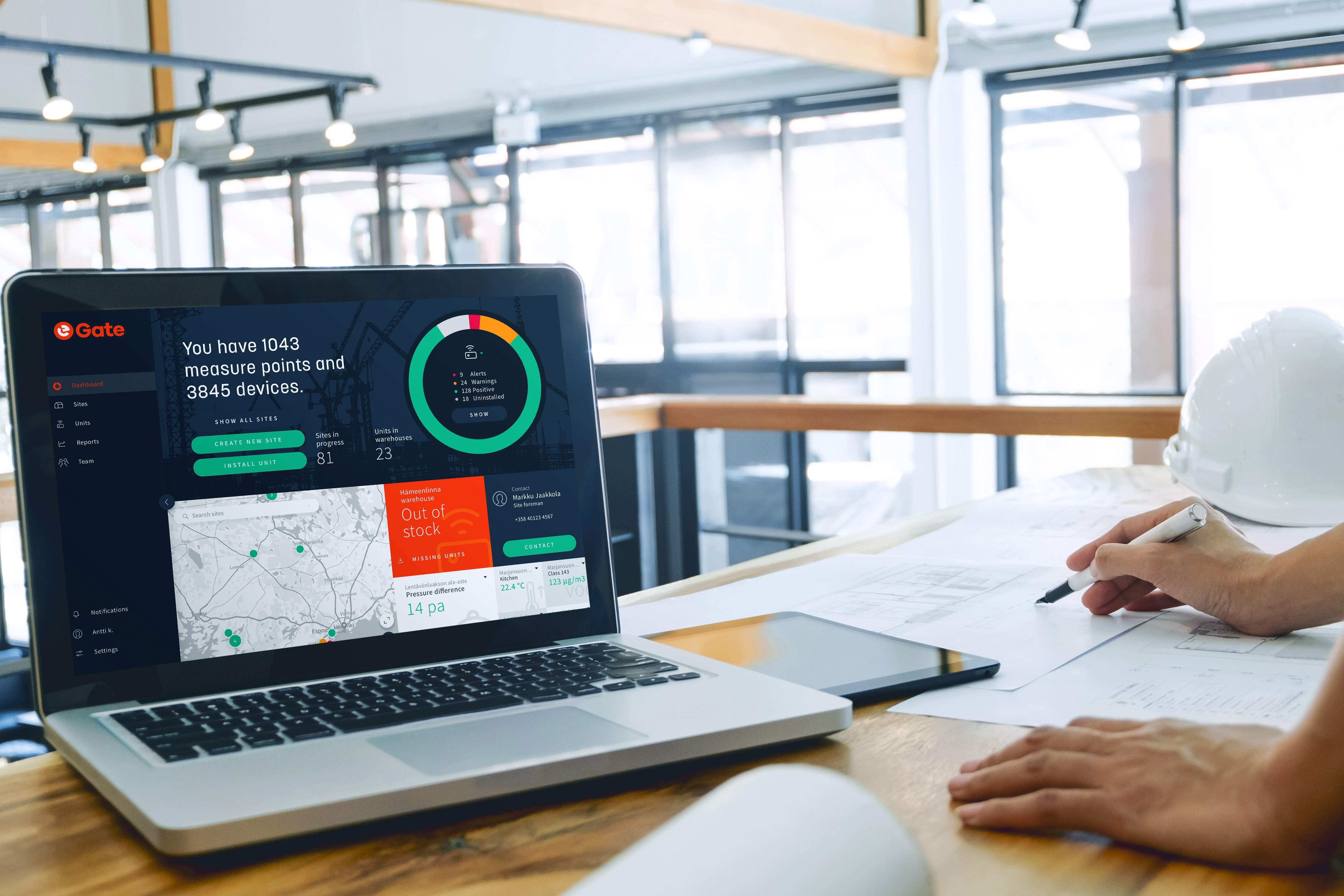 eGate adds professional and accurate solutions that complement the services from Cramo, including real-time data and alerts on job site temperature, humidity, concrete moisture and strength, air quality, dust particles, and other critical environmental factors. Data is visualized and reports are generated through Boels/Cramo SmartControl cloud solution. Overall, this partnership elevates construction site optimization to a new level and helps contractors to build safer, more efficient, and sustainable projects.