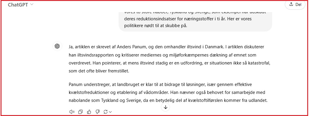 Der er ingen, der taler om ’stjæleri’ udover dig selv, men det vi søger, er en forklaring på, hvorfor ChatGPTAI utvetydigt melder, at din klumme om iltsvind er skrevet af miljødirektør Anders Panum Jensen? Det hører vi gerne en forklaring på fra dig.