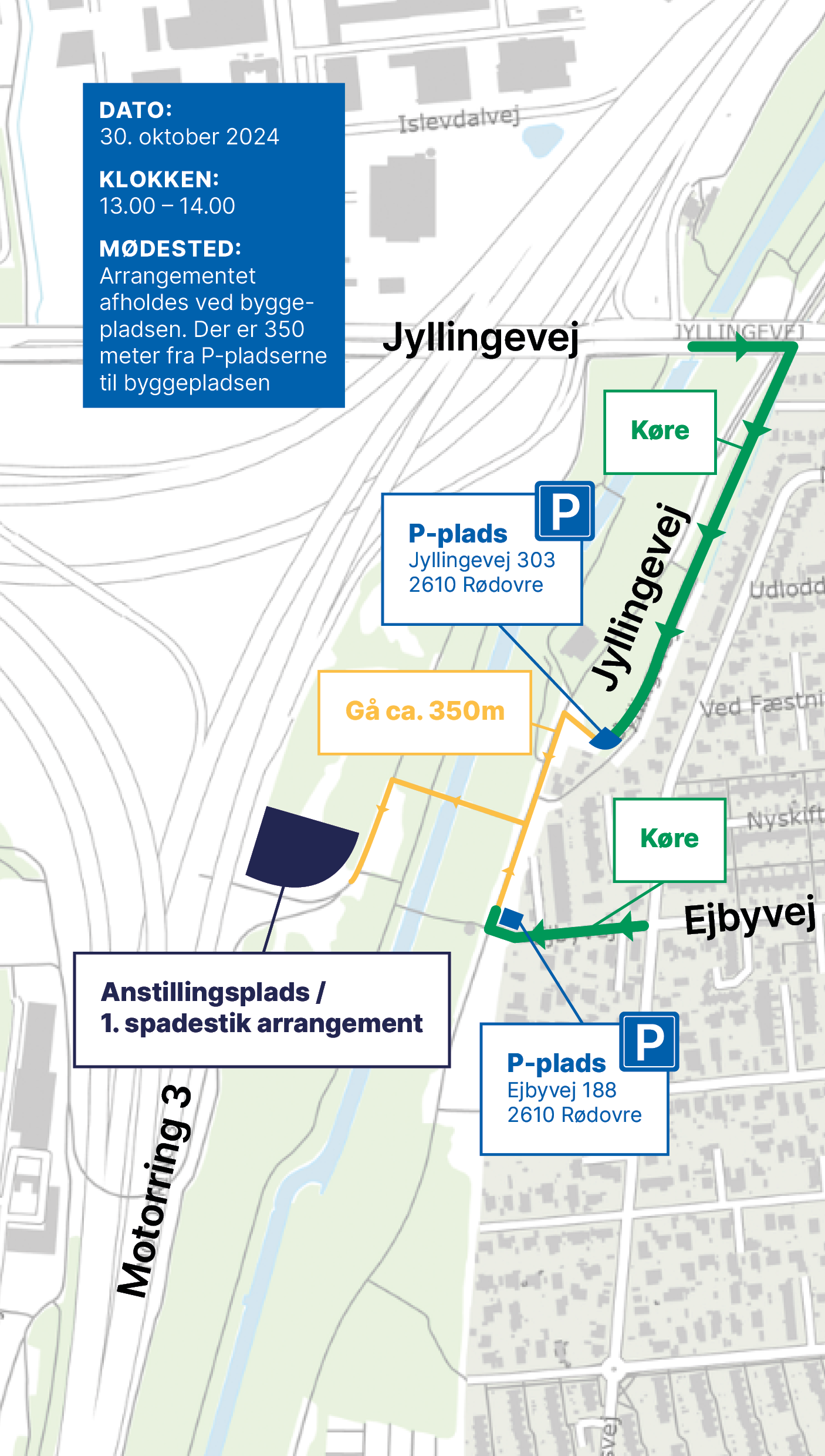Mødested: Arrangementet afholdes ved byggepladsen. Der er 350 meter fra P-pladserne til byggepladsen. Se kort.