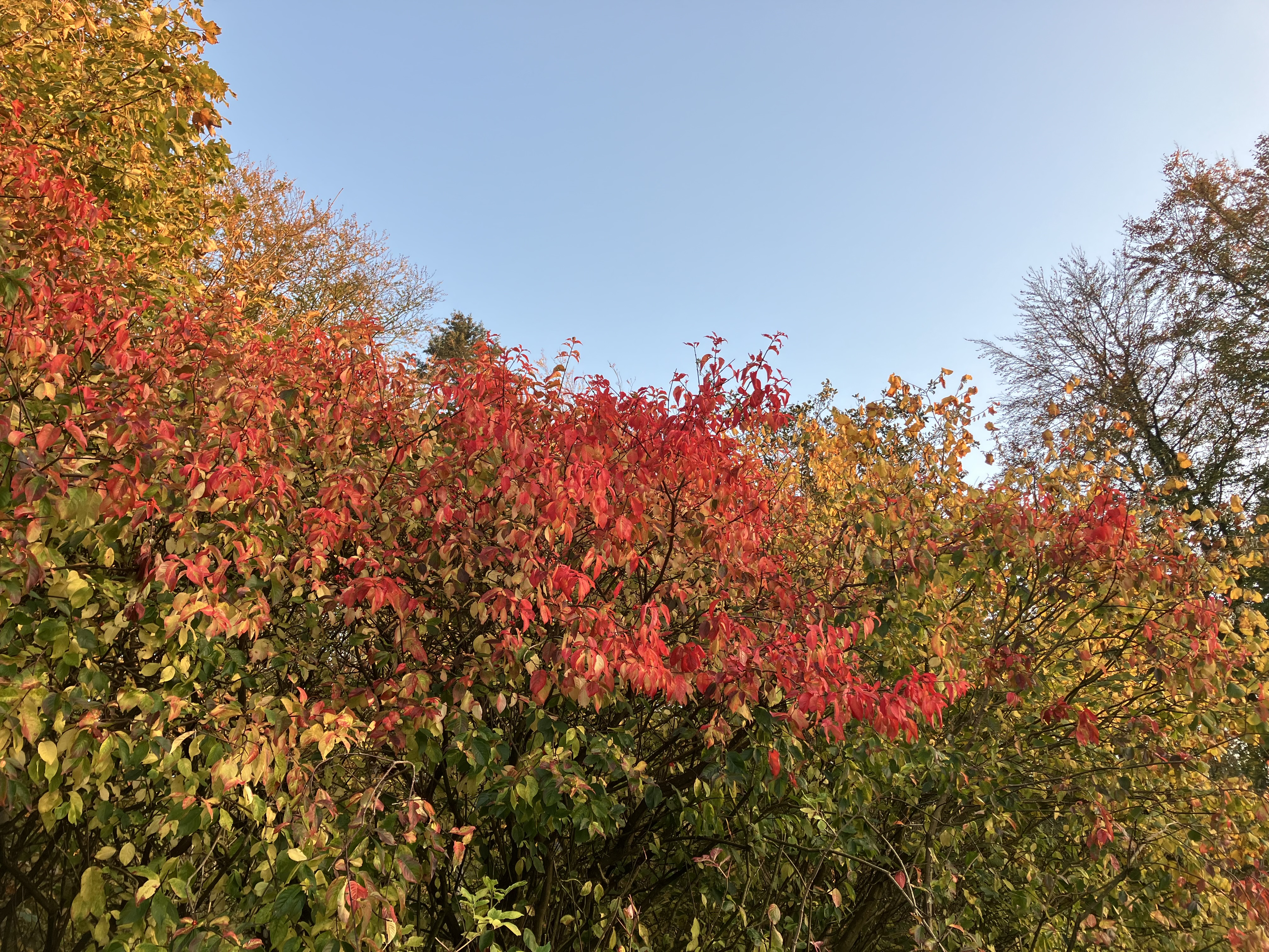 I EFTERÅRETS kernesalme ”Nu falmer skoven trindt om land” synes Grundtvig at undersælge paletten. For - på en rolig og solfyldt dag i slutningen af oktober gløder skov og hegn med pangfarver; med den dybblå himmel som baggrund ildrøde blade af benved, fosforgule blade af navr og løn, orange bøgetoppe, cognacfarvede længere nede sammen med stadigt grønne blade. Og i skovbund og på skovstier våde bladmosaikker i bronze, brunt, gult og stænk af lysegrønt. Det flammer, snarere end falmer, og vindstød gennem trækronerne sender spredte bølger af svagt raslende løvfald afsted i luften som smukt dalende og sejlende sene sommerfugle på vej ned til landing. Det har så igen sin mere faglige forklaring.