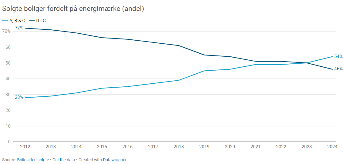 Tallene viser tre markante skift i andelen af solgte boliger med de tre bedste energimærker. Det første kommer i 2019. Det er året efter, at energiaftalen afsatte millioner af kroner i tilskud til private, der ville energirenovere deres boliger. Det andet sker i 2021 – året efter coronas start, hvor andelen af solgte boliger med gode energimærker igen tager et stort hop opad, og til sidst i 2023, hvor andelen af solgte huse med energimærke A, B og C for første gang oversteg andelen af solgte huse med andre energimærker.