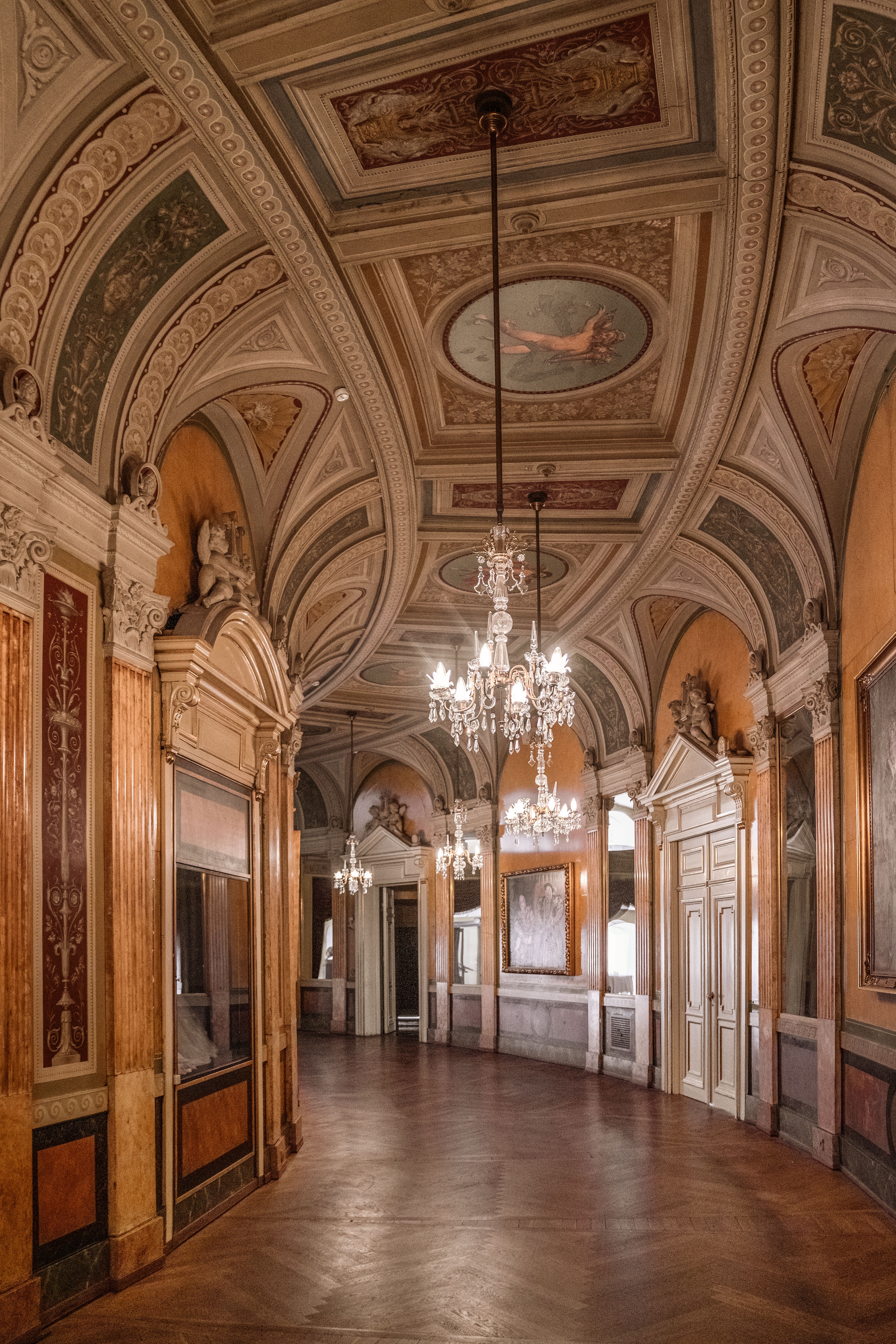 Balkonrundgangen omkranser hele teatersalen på balkonetagen og er inspireret af 1800-tallets store, europæiske teaterbyggerier, opført i historicistisk stil med bemalede lofter og detaljerige stukudsmykninger.