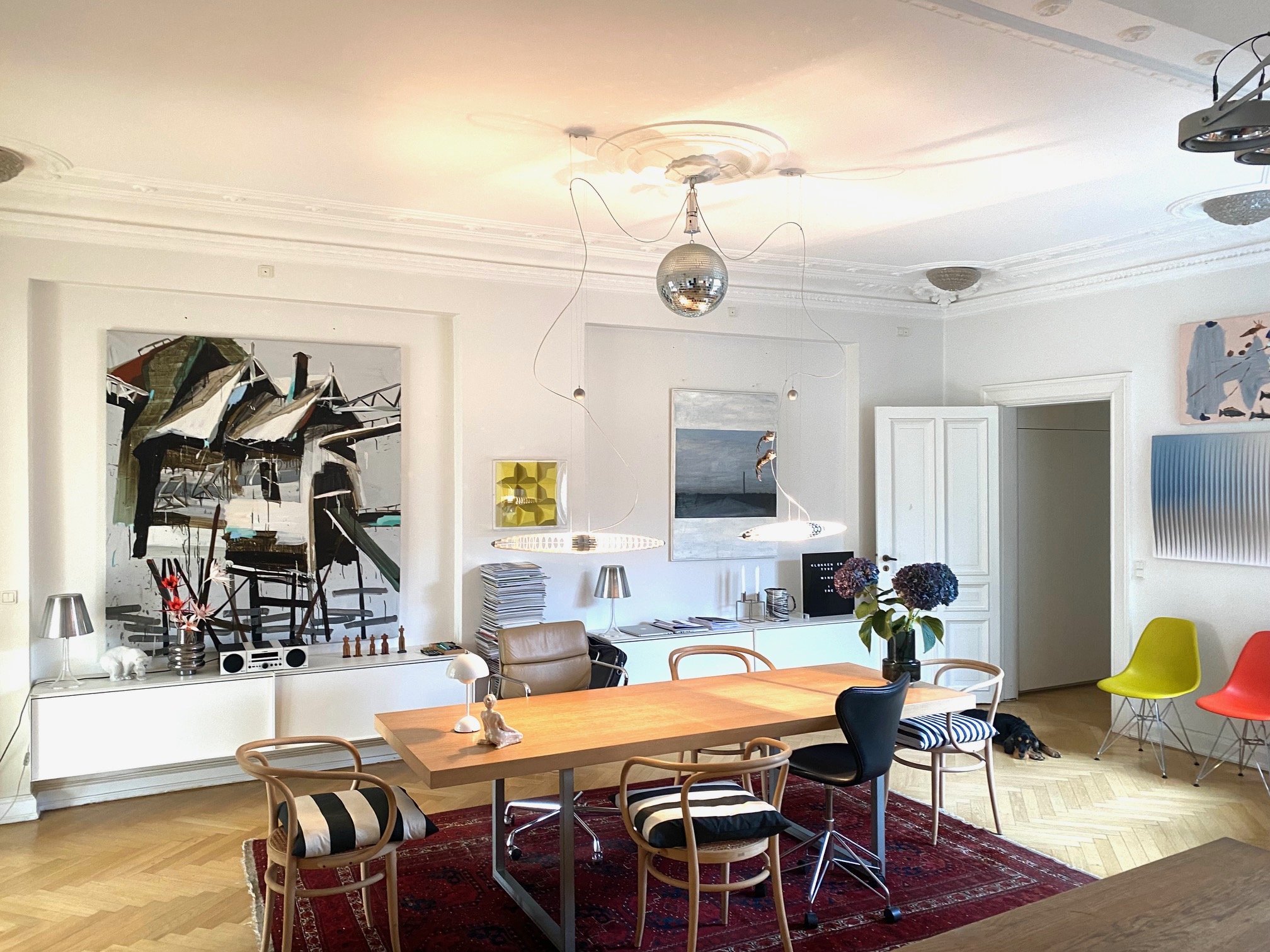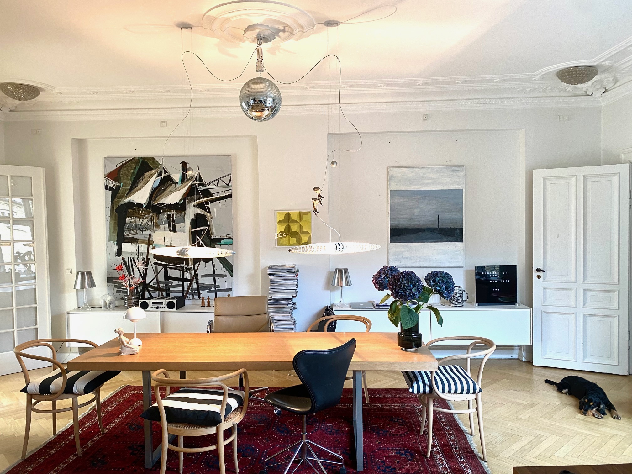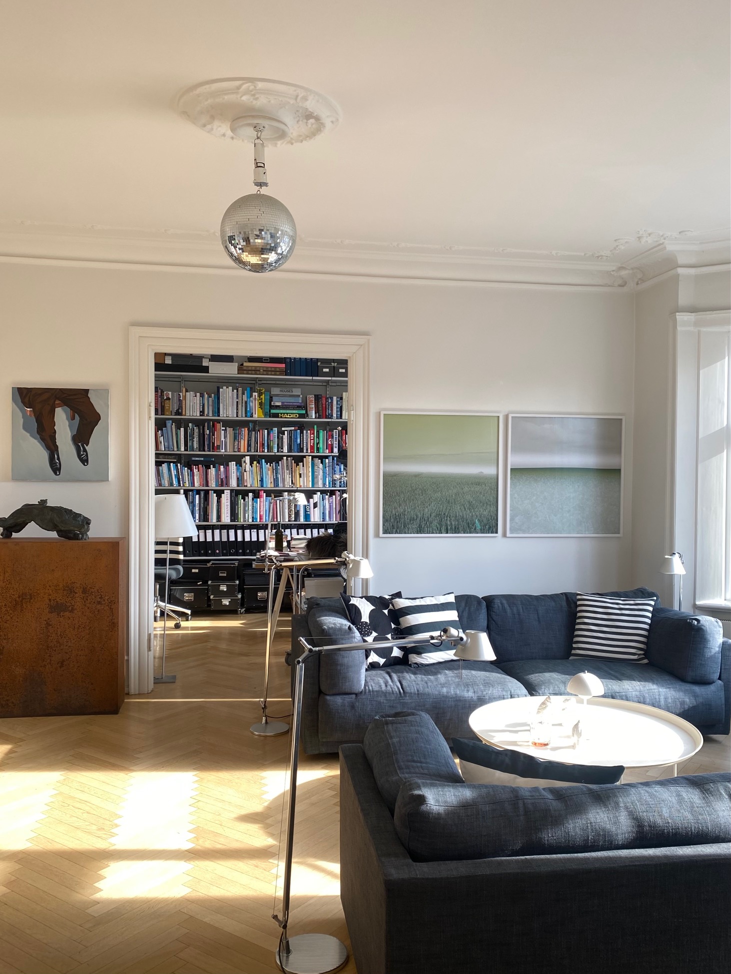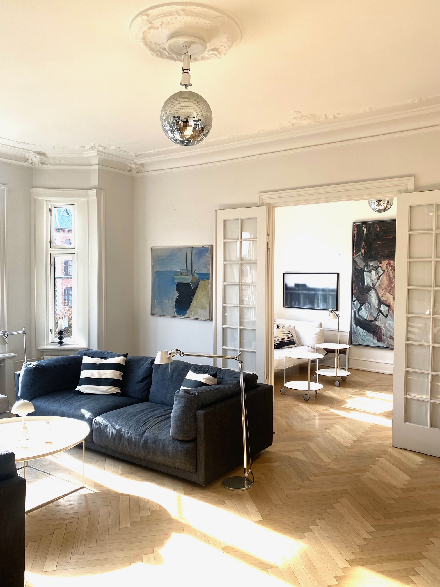 Kunstsalonen flytter ind hos arkitekt Rikke Birn, der bor i en 210 m2 lejlighed på Frederiksberg Allé. Lejligheden ligger på solsiden på 4. sal med højt til loftet, store vinduer, lys og udsigt til Frederiksberg. Rikke Birn, der har været gæst og kunde hos Kunstsalonen i mange år, bor selv med masser af kunst, bøger og arkitektens særlige blik for indretning.