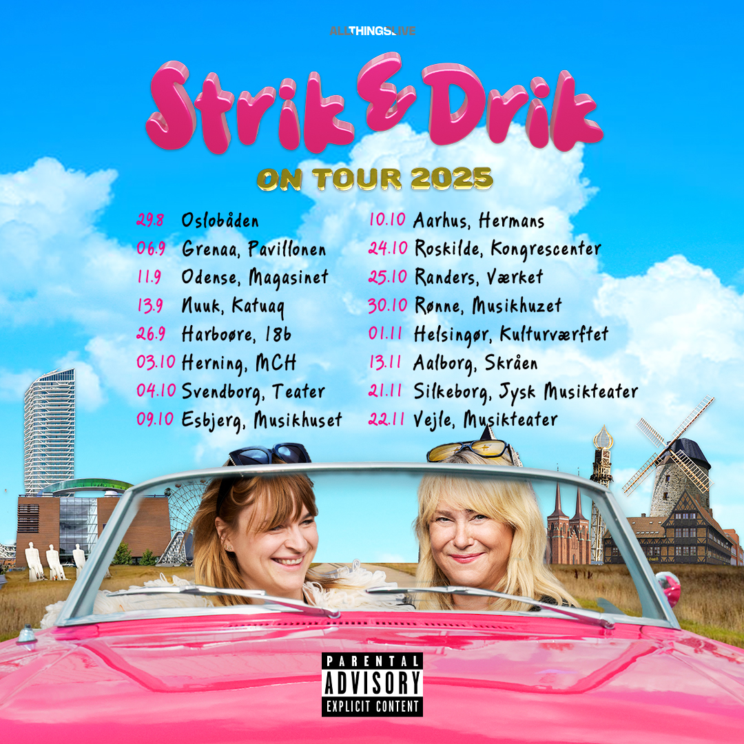 Strik & Drik er tilbage i 2025 med en Danmarksturné, hvor Christine Feldthaus og Lærke Bagger indtager scener landet over. Forvent garn, grin, svinere, løssluppenhed, sandheder og en masse ægte hemmeligheder.