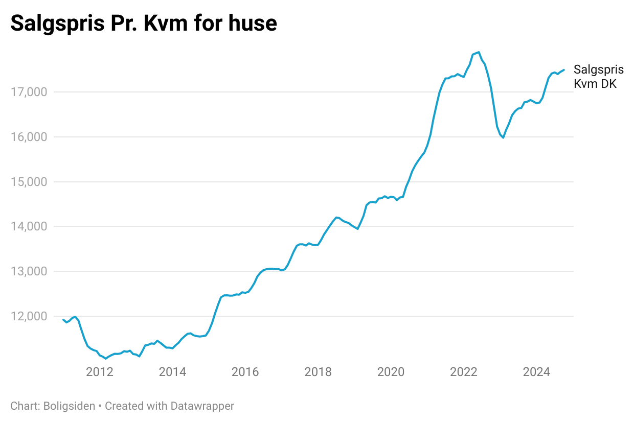 Huspriserne toppede i juni 2022, hvor de lå på 17.889 kroner pr. kvadratmeter. Den økonomiske krise sendte huspriserne i frit fald, og efter et stort dyk kom de under 16.000 kroner i februar 2023. Herefter er huspriserne kommet stærkt igen.