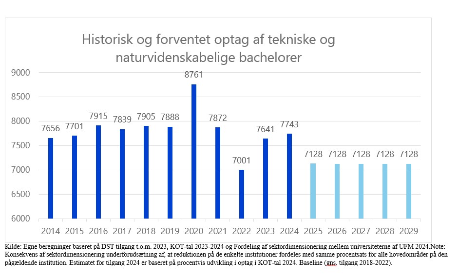 ”Der er brug for flere med disse uddannelser - ikke færre, hvis alle resort-ministeriernes drømme og visioner skal gå i opfyldelse. Hvem skal bringes os i mål med en life science-strategi, hvem skal udvikle kunstig intelligens, kvantecomputere og sikre Danmark mod cyberangreb, og hvem skal udtænke og skabe nye løsninger, der kan sikre, at vi rent faktisk får en grøn omstilling, når der ikke uddannes nok. Derfor er sektordimensioneringen helt skæv, og udsigten til fem år, hvor optaget fastholdes på samme alt for lave niveau, minder mest af alt om en flatliner, hvor væksten nærmest erklæres død,” siger hun.