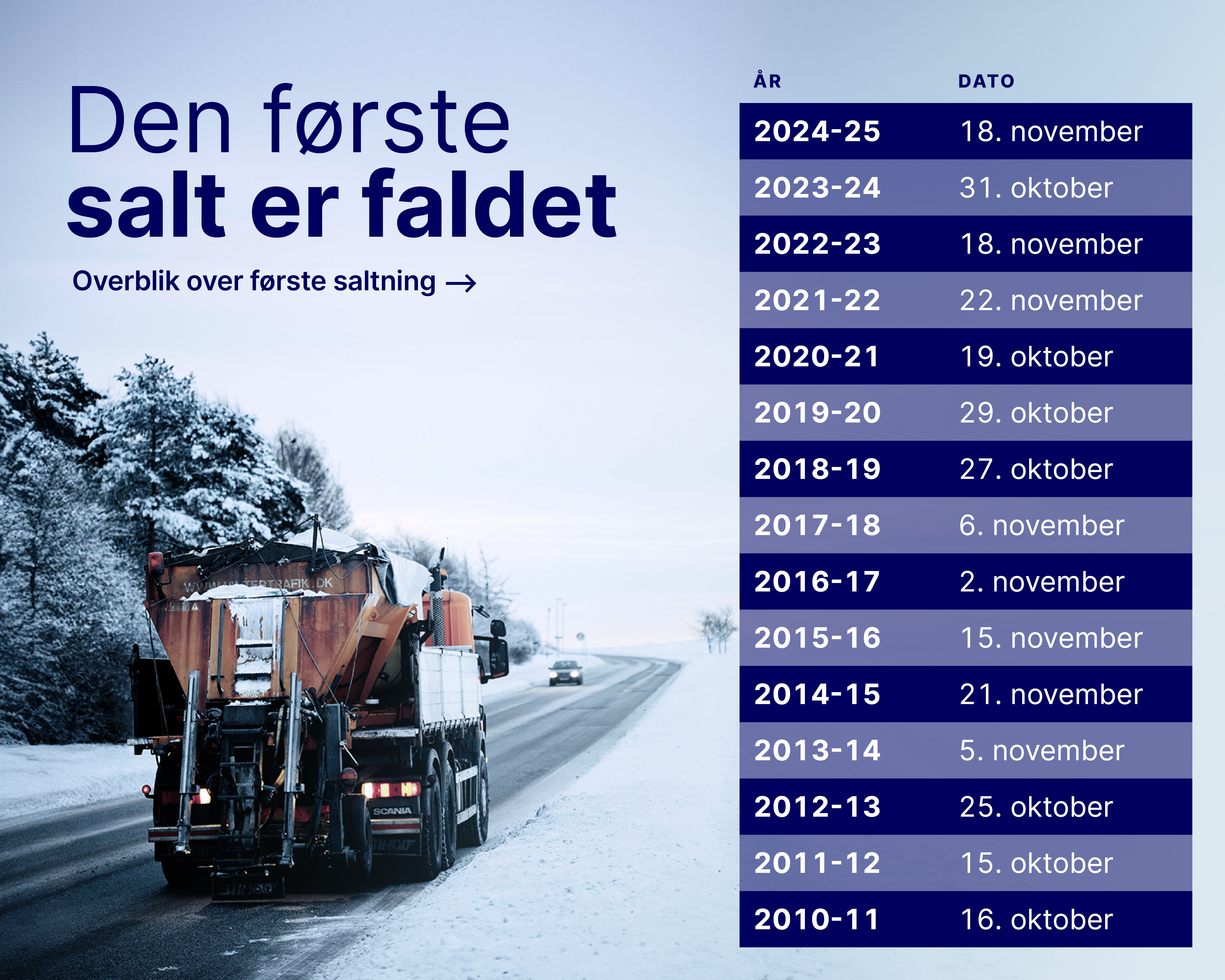 De seneste 14 år, som Vejdirektoratet har data for, ligger tidspunktet for vintersæsonens første rigtige saltning cirka mellem midt oktober og midt november.