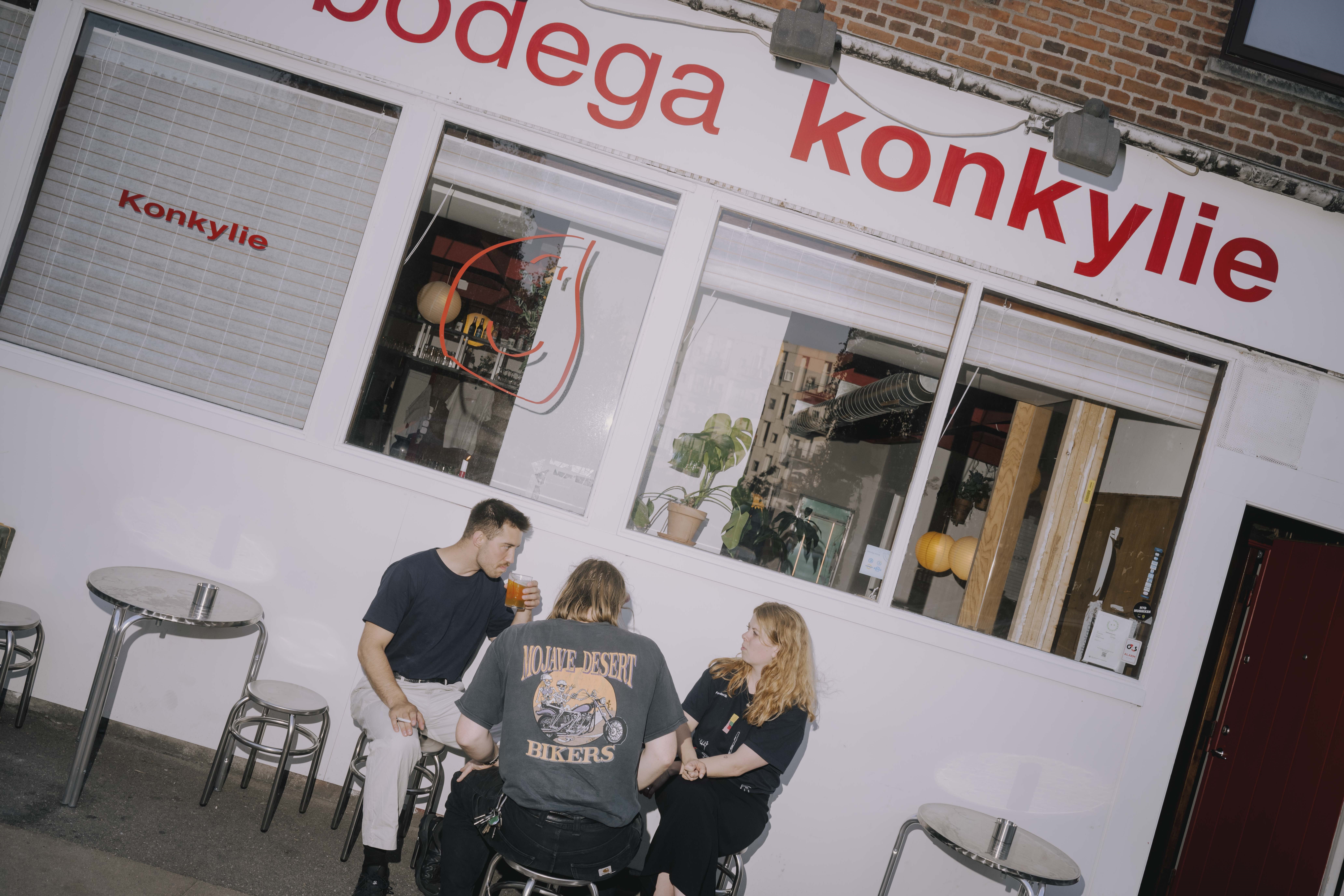 Bodega konkylie - "Vil I ha' det?" Glashuset var et klassisk brunt værtshus. Mathis, Malte og Signe kom her ret ofte. En aften i januar skulle vise sig at være ganske anderledes end de tidligere besøg. Det var den aften, Jytte, bestyreren af Glashuset, fortalte dem, at hun var klar til at gå på pension. ”Vil I ha’ det?” spurgte hun dem ligeud. Og det ville de. De fik travlt med at omdanne det gamle, slidte værtshus til noget mere tidssvarende, mindre anakronistisk – noget, der var mere dem. Efter to uger var de i mål og klar til at åbne. Nu under navnet konkylie. (Med lille k). Allerede på facaden er forandringen åbenlys: Hvor der før stod ’Glashuset’ med gotisk skrift, står der på en råhvid baggrund nu ’konkylie’ med rødt. Baren indenfor er knaldrød, og borde og stole er små og rene og helt uden rødternet betræk. Man ser straks, at her ingen reklamer er. Hverken for Tuborg eller Carlsberg. Ingen bordskånere, flag, kander, eller hvad man ellers støder på af udstyr og nips på et værtshus. Konkylie sender på en helt egen, uforstyrret frekvens. I baren kan man få en øl fra Bajeur eller vælge et glas naturvin. ”Vi kom frem til, at en bodega ikke handler om, at man kan få alt muligt,” siger Malte. ”Der skal være plads til alle. Man skal fortælle røverhistorier. Og så skal der være gode, men ikke mange ting i baren.” |