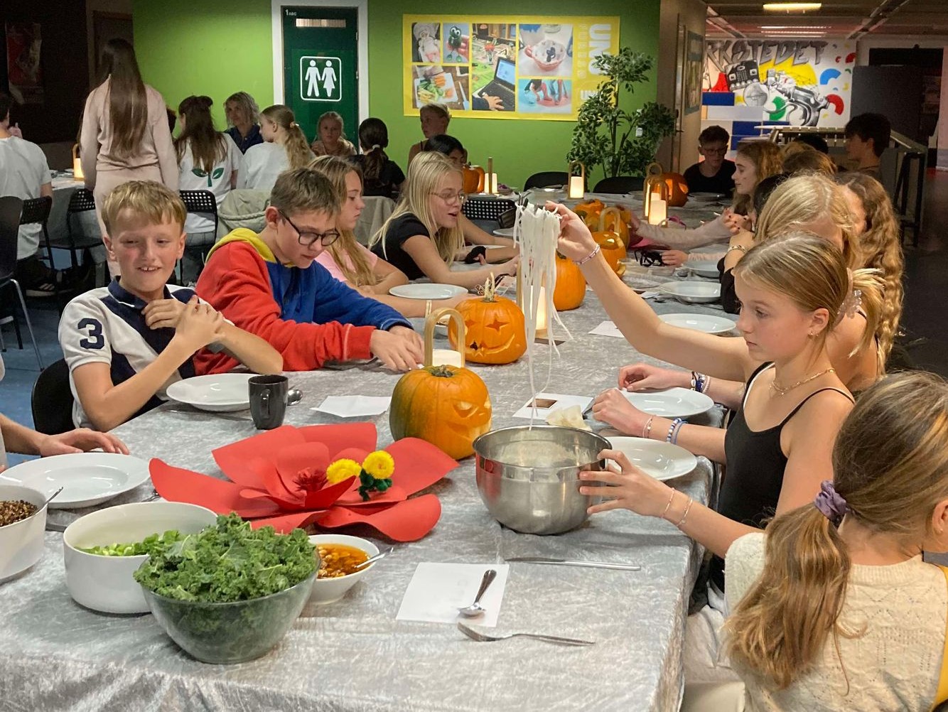 I oktober blev den første fællesspisning afholdt med halloween som tema. 34 unge i alderen 12-21 år og kokken Eline Lange tilberedte vegetariske græskarretter med friske råvarer fra det økologiske gartneri Godis Grønt.