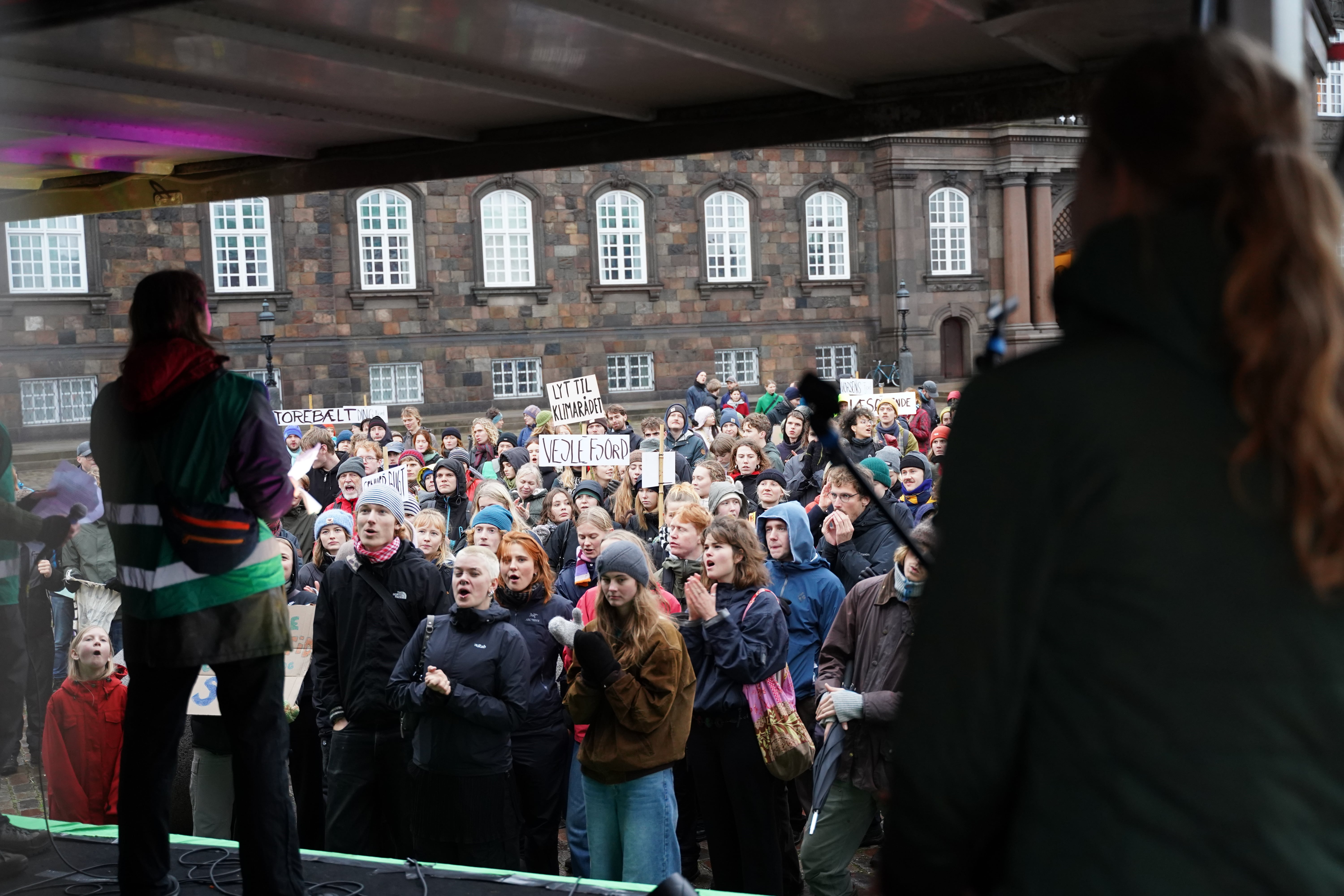 Klimademonstration i Rigsdagsgården i går arrangeret af Den Grønne Ungdomsbevægelse i protest mod Lars Aagaard og regeringens udspil om kun at reducere Danmarks drivhusgasudledninger med 82-85% i 2035.