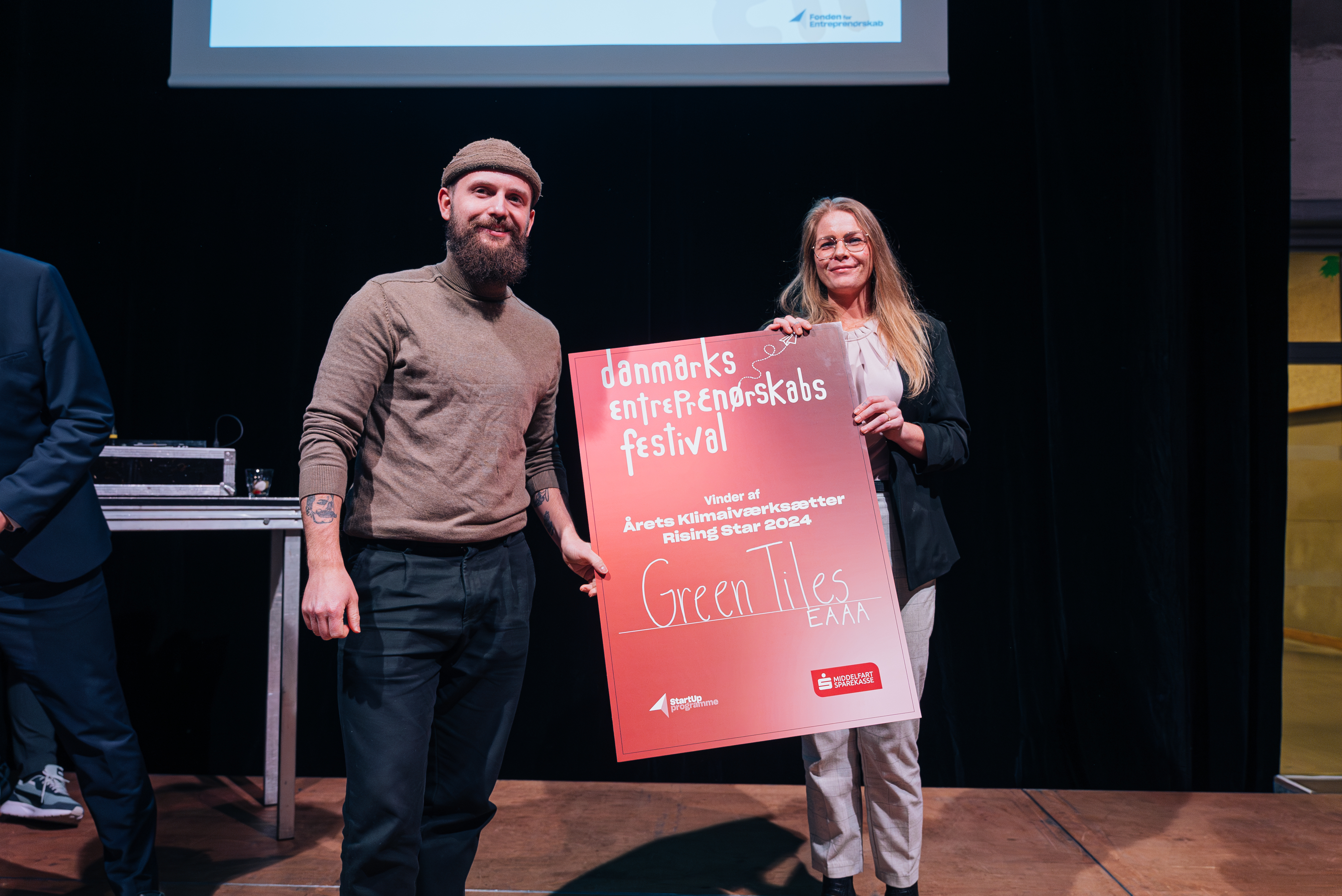 Prisen som Årets Klimaiværksætter - Rising Star gik til Mette Munk Madsen og Tobias Funding Sørensen fra Erhvervsakademi Aarhus med virksomheden Green Tiles, som vil lave fliser i genbrugsplast, der skal erstatte den gængse flise. Fliserne vil kunne genbruges igen og igen både til fliser og til andre ting. Holdet udtaler: