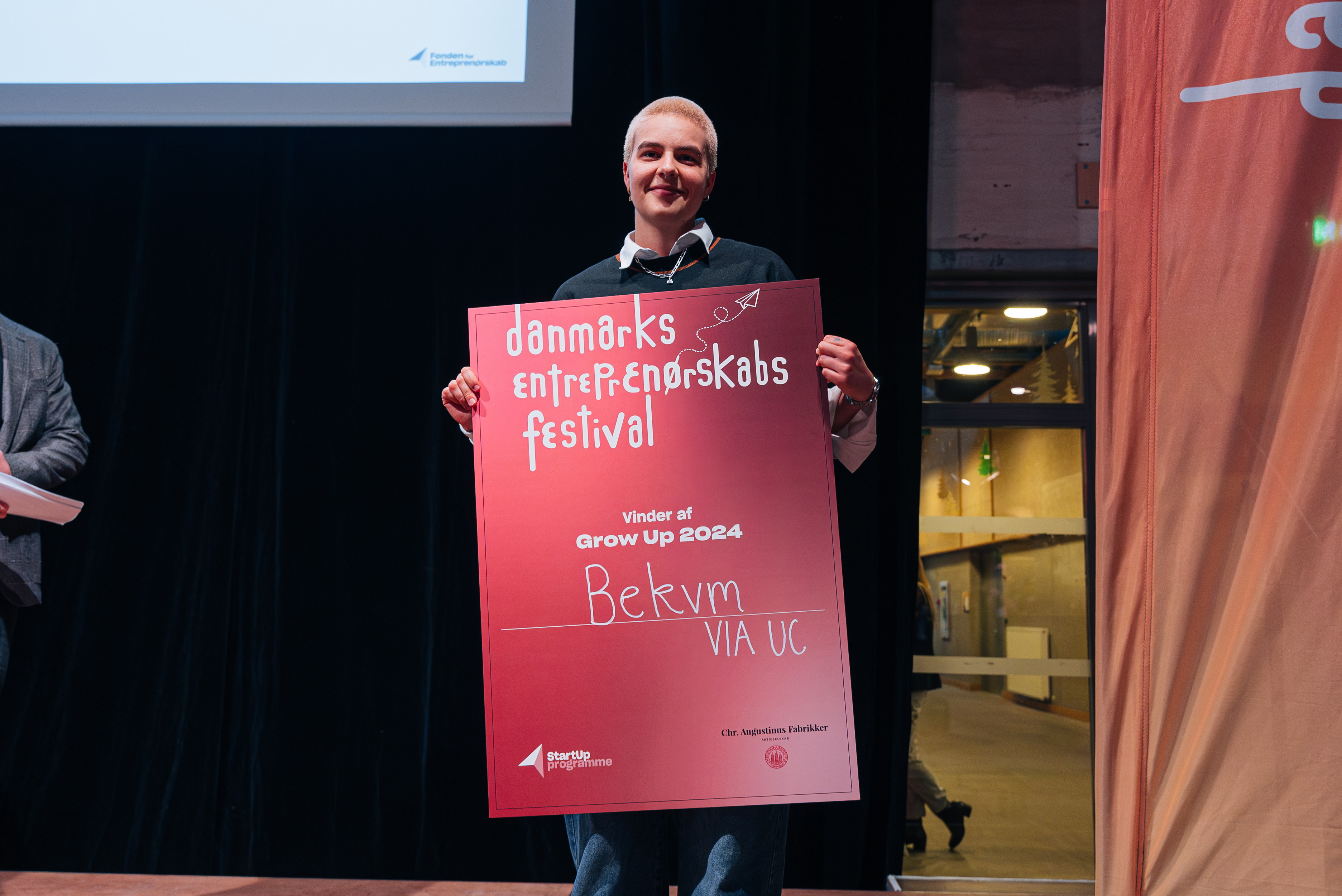 Årets vinder i Grow Up sporet blev Bekvm fra VIA University College Campus Aarhus C. Deres idé er et kønsinkluderende tøjunivers, der bryder med de traditionelle binære kønsnormer og skaber et rum for selvudfoldelse, hvor LGBTQ+ personer kan føle sig repræsenterede. Bag Bekvm står Calle Juhl: