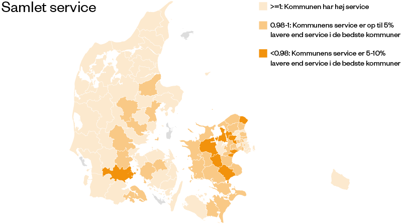 Forskerne har nemlig analyseret den kommunale service ved hjælp af 55 serviceindikatorer - for alt fra skoler og dagtilbud til ældrepleje, kulturtilbud, beskæftigelsesindsats til anbringelser, tandpleje og veje - og har sammenholdt serviceniveauet med kommunens udgiftsniveau.