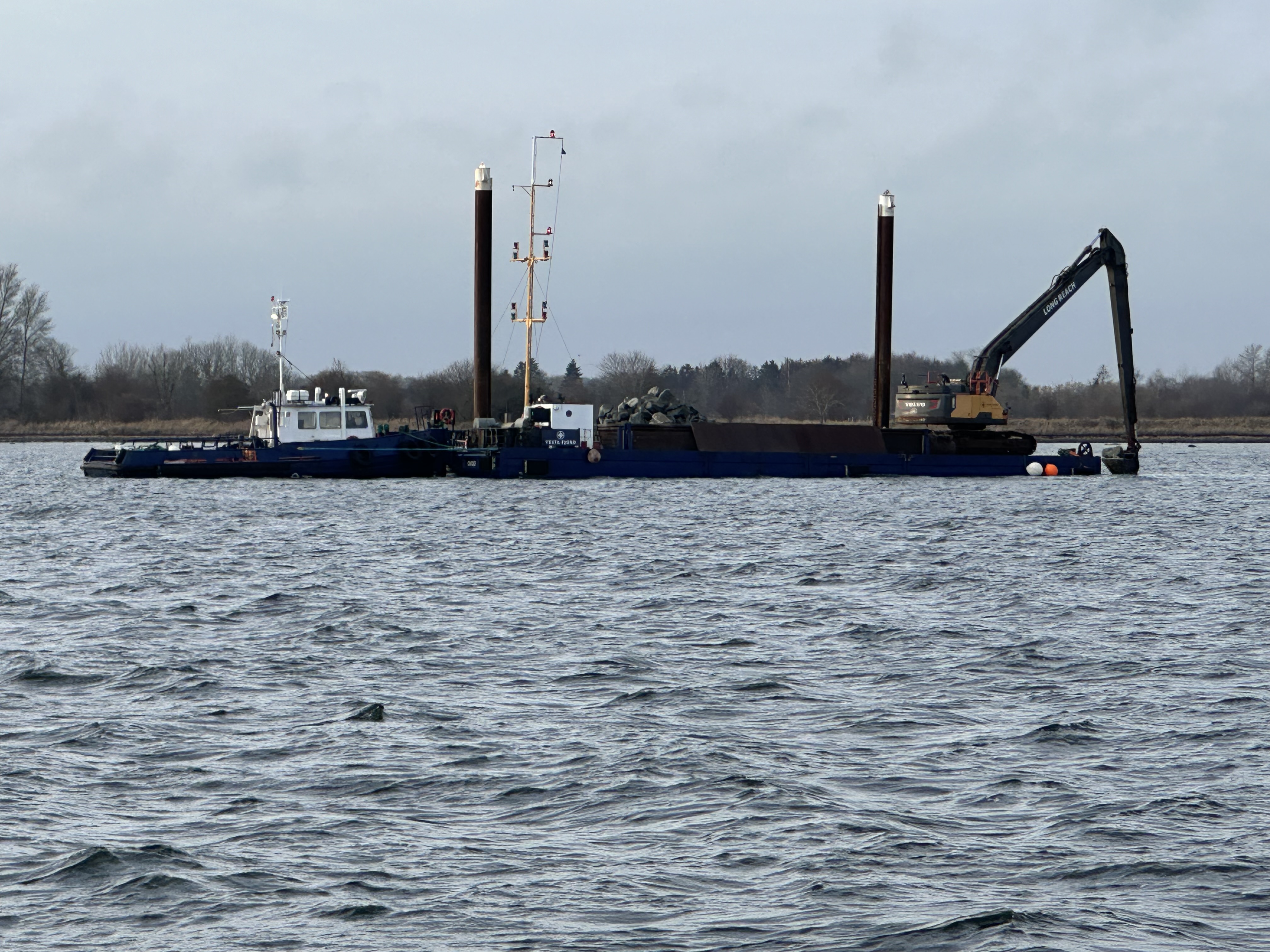I denne uge bliver de første af i alt 4.500 tons sten sænket ned i Odense Fjord fra en pram ved kysten til Nordfyns Kommune. Når arbejdet om få dage er færdigt, vil stenene udgøre såkaldte ’stenrev’.