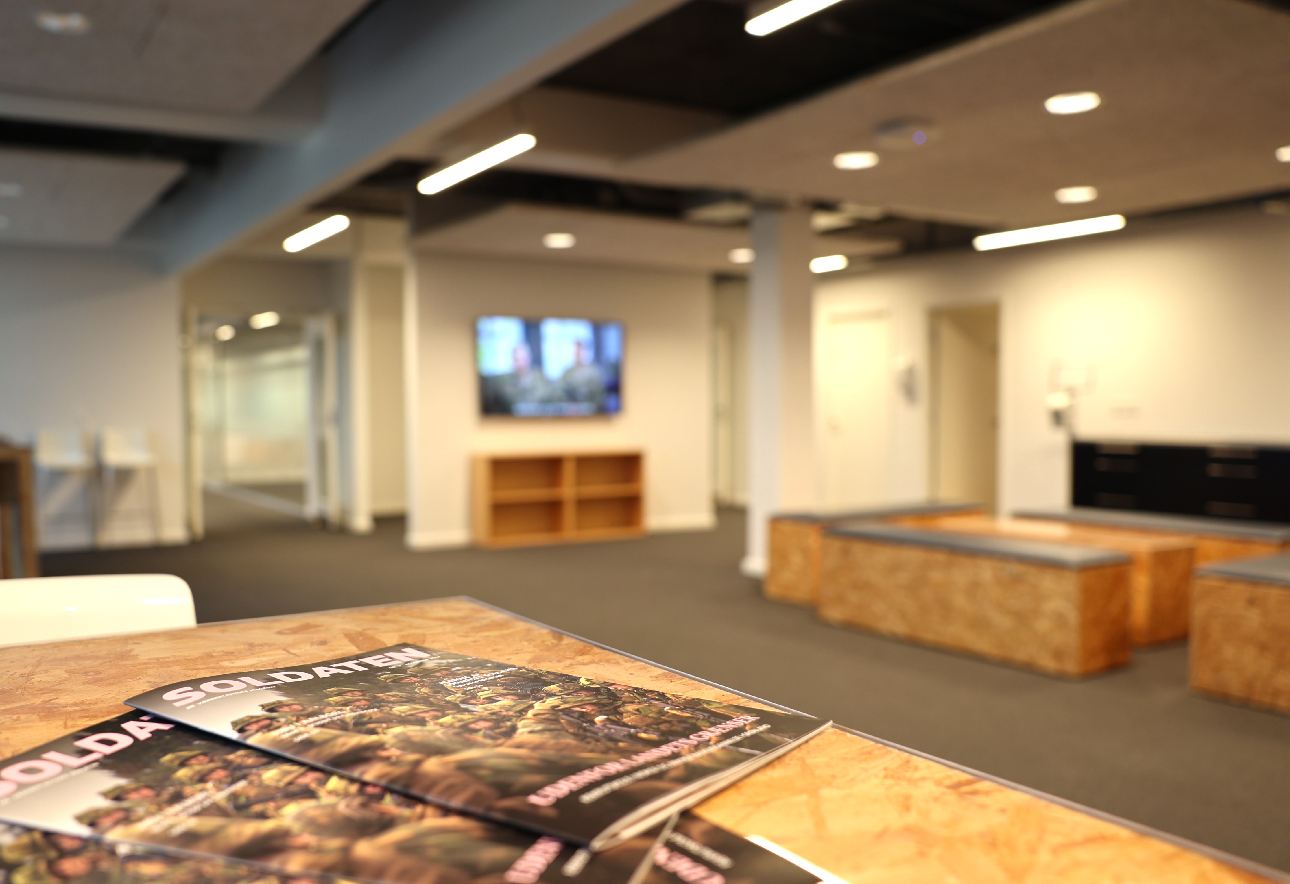 På øverste etage er der cirka 80 kontorpladser, der i den kommende tid kommer til at huse medarbejdere fra Forsvarsministeriets Materiel- og Indkøbsstyrelse. Som mange andre steder i Forsvaret er der vokseværk, og samtidig er de nuværende faciliteter under renovering.