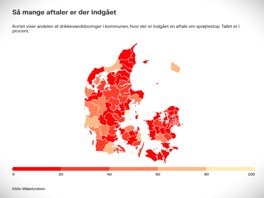 Trods massive kampagner for at overtale landbruget til at stoppe med at sprøjte drikkevandet, så viser Miljøministeriets seneste status fra december i år, at kun en ud af hver fem (20 %) drikkevandsboringer er sprøjtefrie.