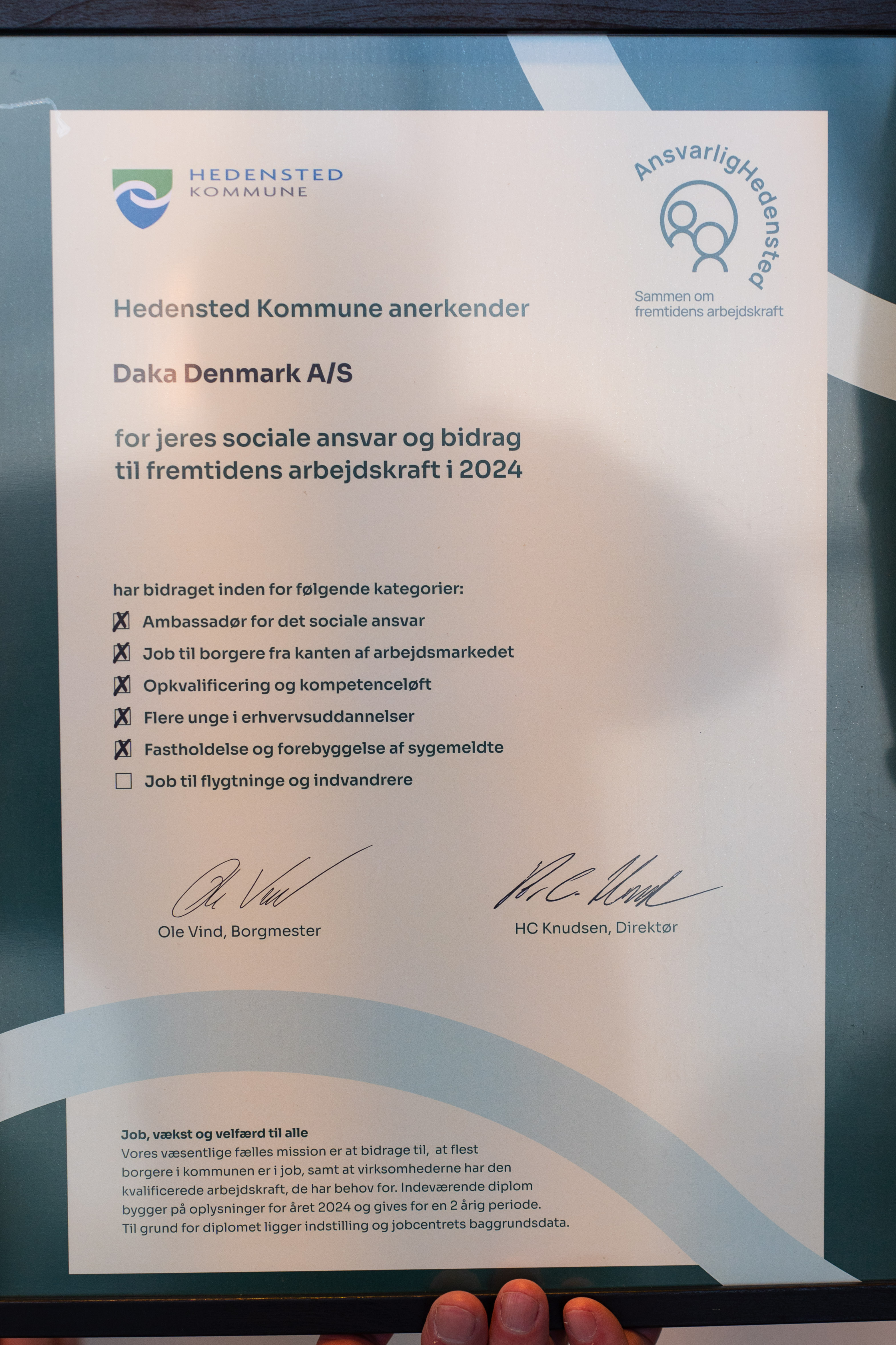 På vegne af Daka Denmark A/S modtog hun sammen med Public Affairs Manager Keld Winther Rasmussen diplomet af Borgmester Ole Vind og direktør for beskæftigelse Hans Christian Knudsen.