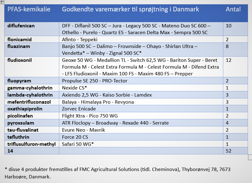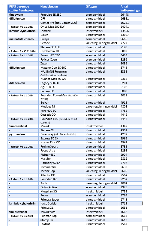 Hertil kommer, at hele 10 ud af de 50 mest anvendte midler er baseret på PFAS-kemikalier som aktivstof.