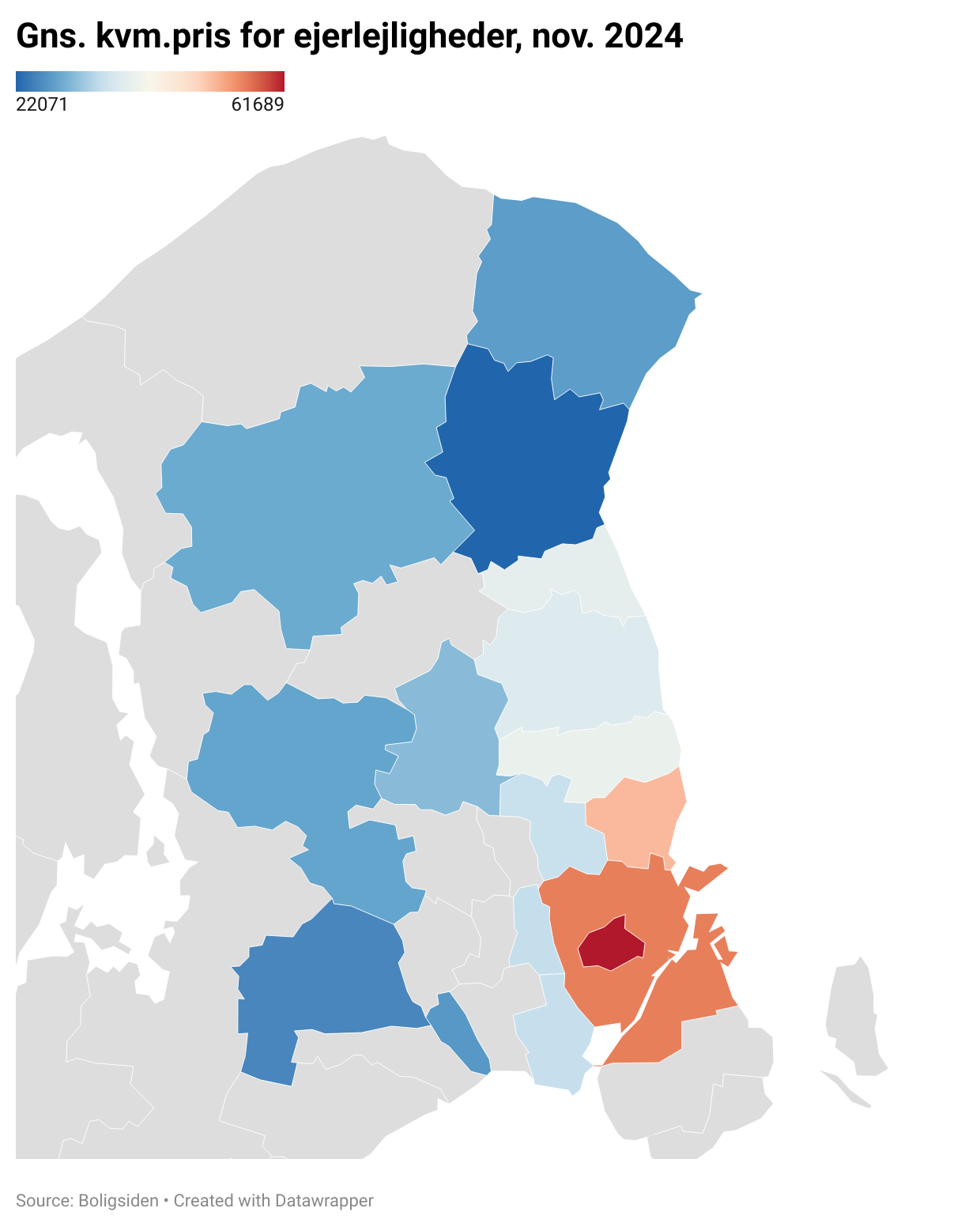 De billigste lejligheder i Region Hovedstaden ligger i Fredensborg, hvor du kan slippe med 22.071 kroner pr. kvadratmeter. Det er endda et lille fald siden måneden før.