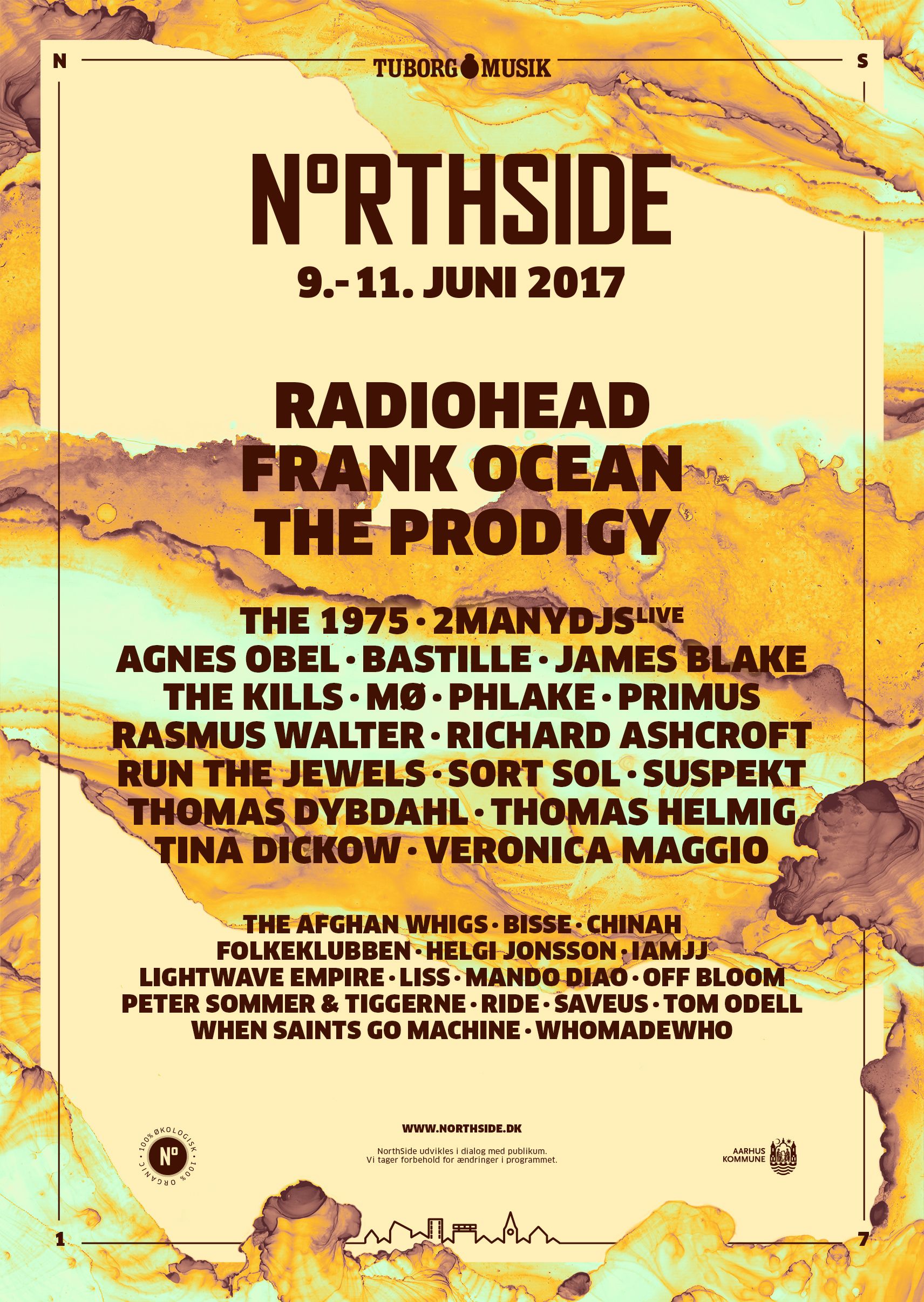 Det samlede program for NorthSide 2017 er som følger: Radiohead, Frank Ocean, The Prodigy, Richard Ashcroft, Run The Jewels, James Blake, Ride, Bastille, The 1975, Tom Odell, Thomas Helmig, Tina Dickow, Mø, Suspekt, Sort Sol, Rasmus Walter, Primus, Thomas Dybdahl, 2manydjs, The Afghan Whigs, The Kills, Veronica Maggio, Mando Diao, Helgi Jónsson, Agnes Obel, Peter Sommer & Tiggerne, Phlake, WhoMadeWho, When Saints Go Machine, Folkeklubben, Saveus, Chinah, Liss, Bisse, Lightwave Empire, IAMJJ og Off Bloom.