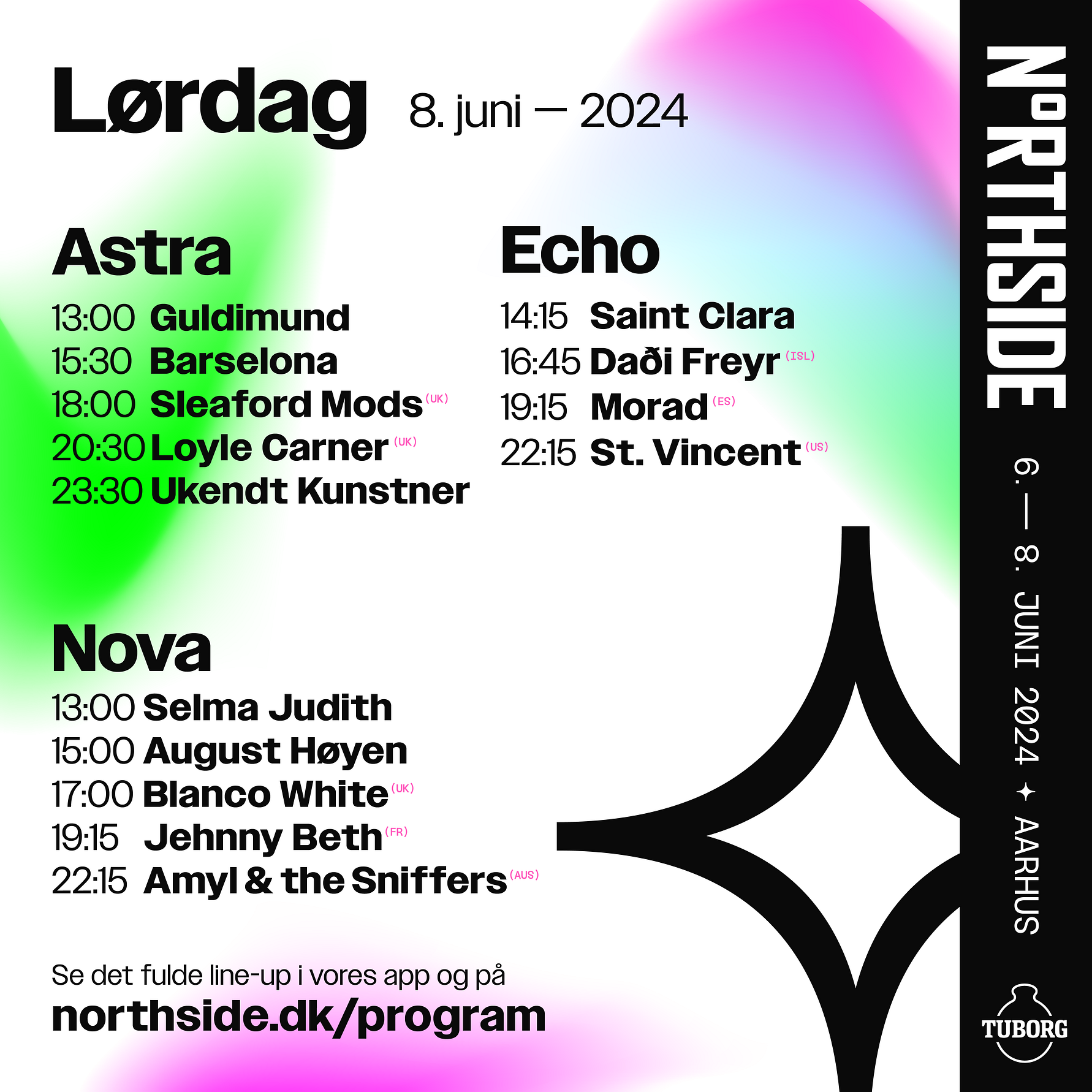 Når klokken slår 19.15 kan man enten indfinde sig foran Echo og opleve Spaniens for tiden største hiphop-artist Morad eller lade sig rive med af den tidligere Savages-frontkvinde Jehnny Beths industrielle, feministiske artpop på Nova. Herfra byder festivalens sidste aftentimer på solid, jazzet hiphop med britiske Loyle Carner, anmelderrost alternativ rock- og artpop med det albumaktuelle ikon St. Vincent og utæmmet postpunk med Amyl & The Sniffers, inden Ukendt Kunstner lukker og slukker årets udgave af NorthSide med et brag af et fælleskabsorienteret hiphop-fest.