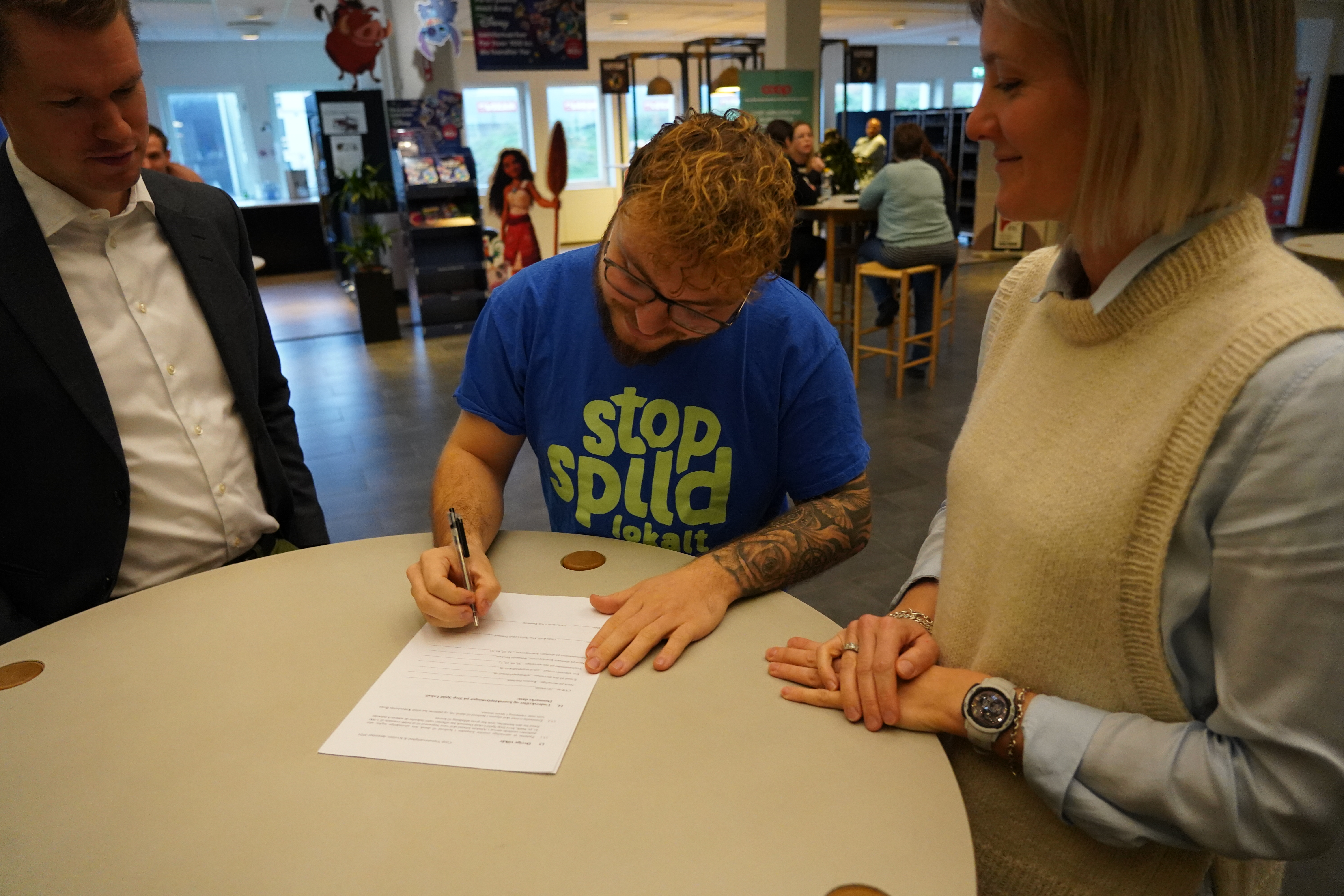 Rasmus Erichsen underskriver aftalen, der skal sikre, at Stop Spild Lokalt fremover kan hente overskudsmad i endnu flere af Coops butikker. (Foto: Coop Danmark)