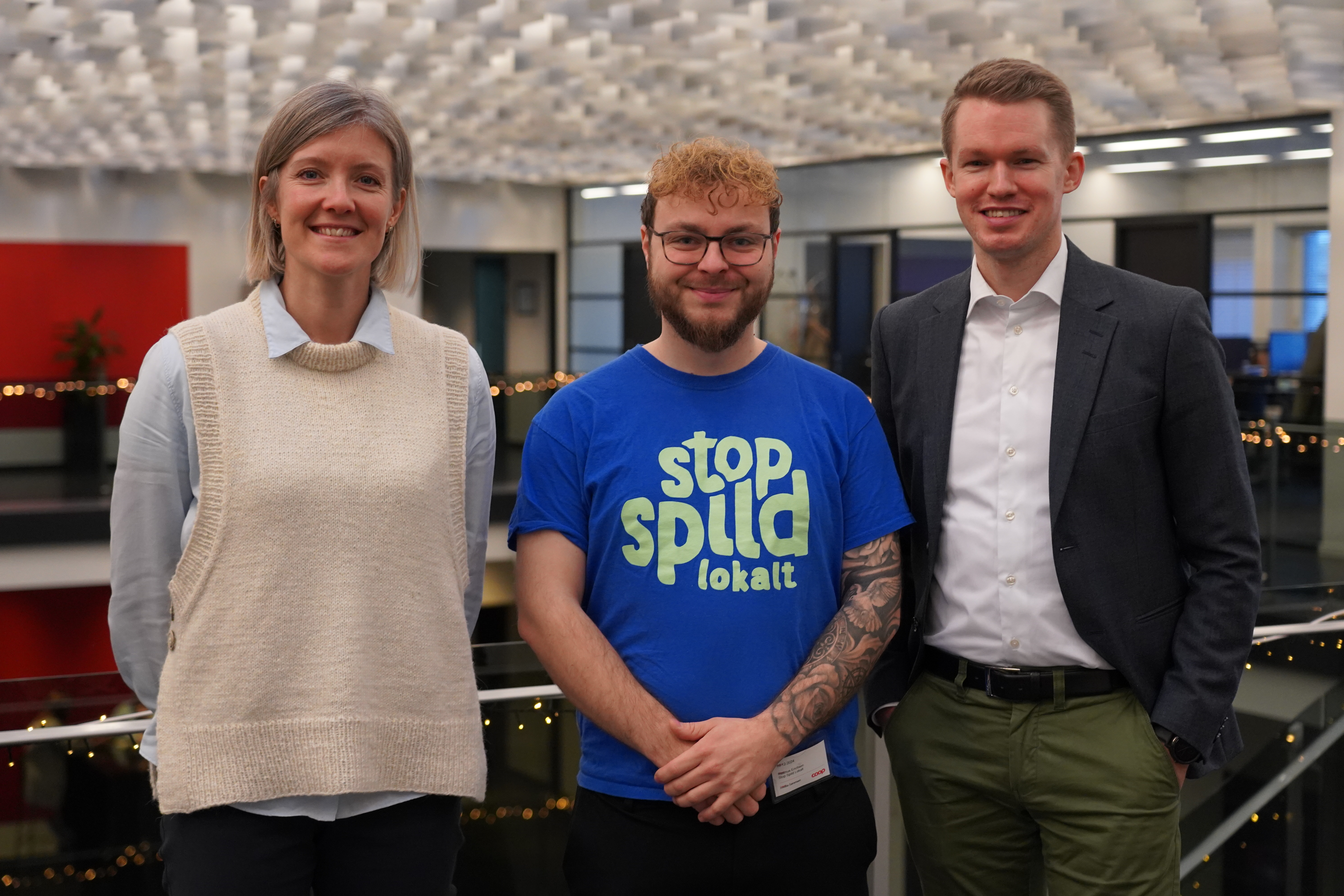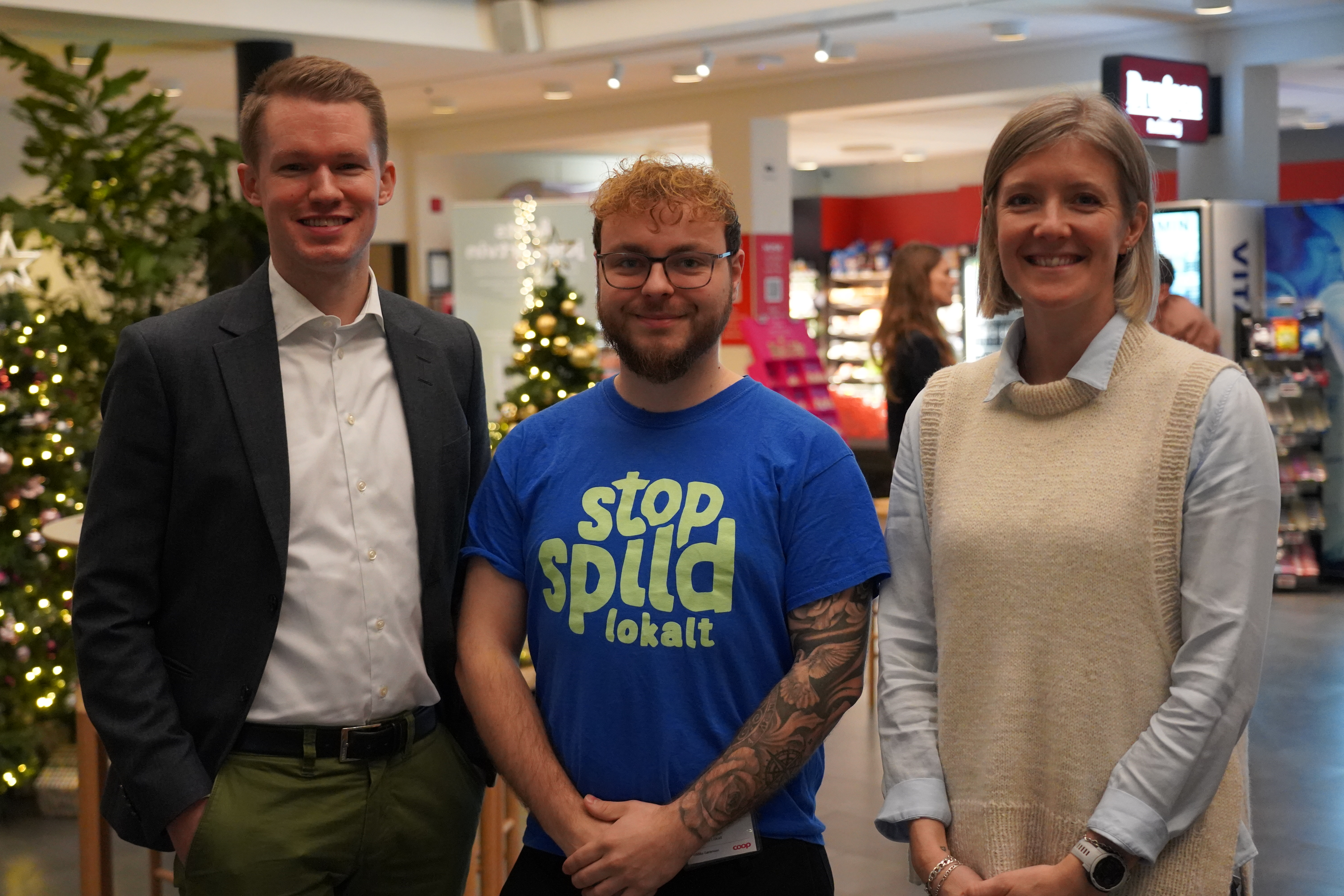 Rasmus Erichsen fra Stop Spild Lokalt mellem Michael Tilsted, direktør i 365discount, og Rikke Krause, direktør i Kvickly og SuperBrugsen. (Foto: Coop Danmark)