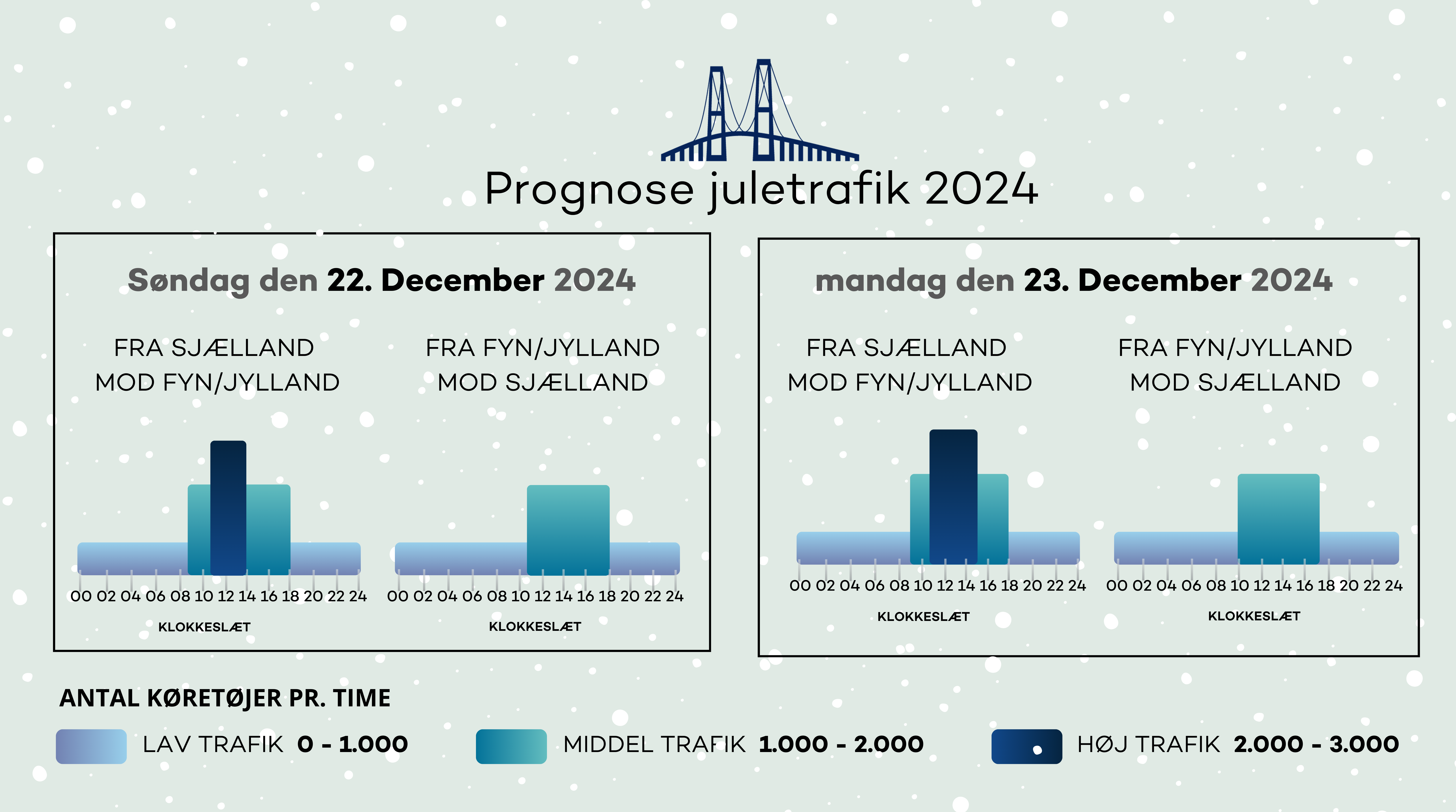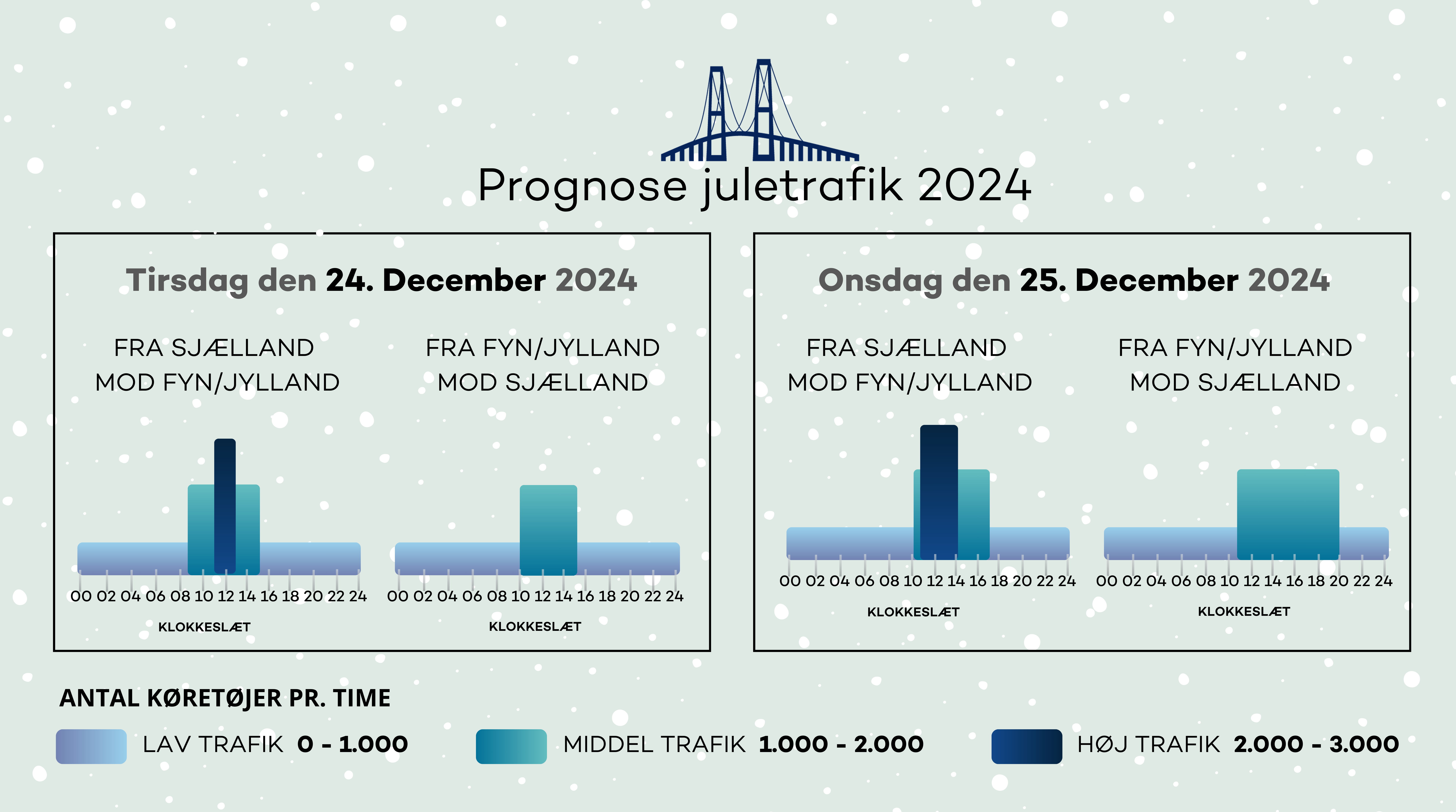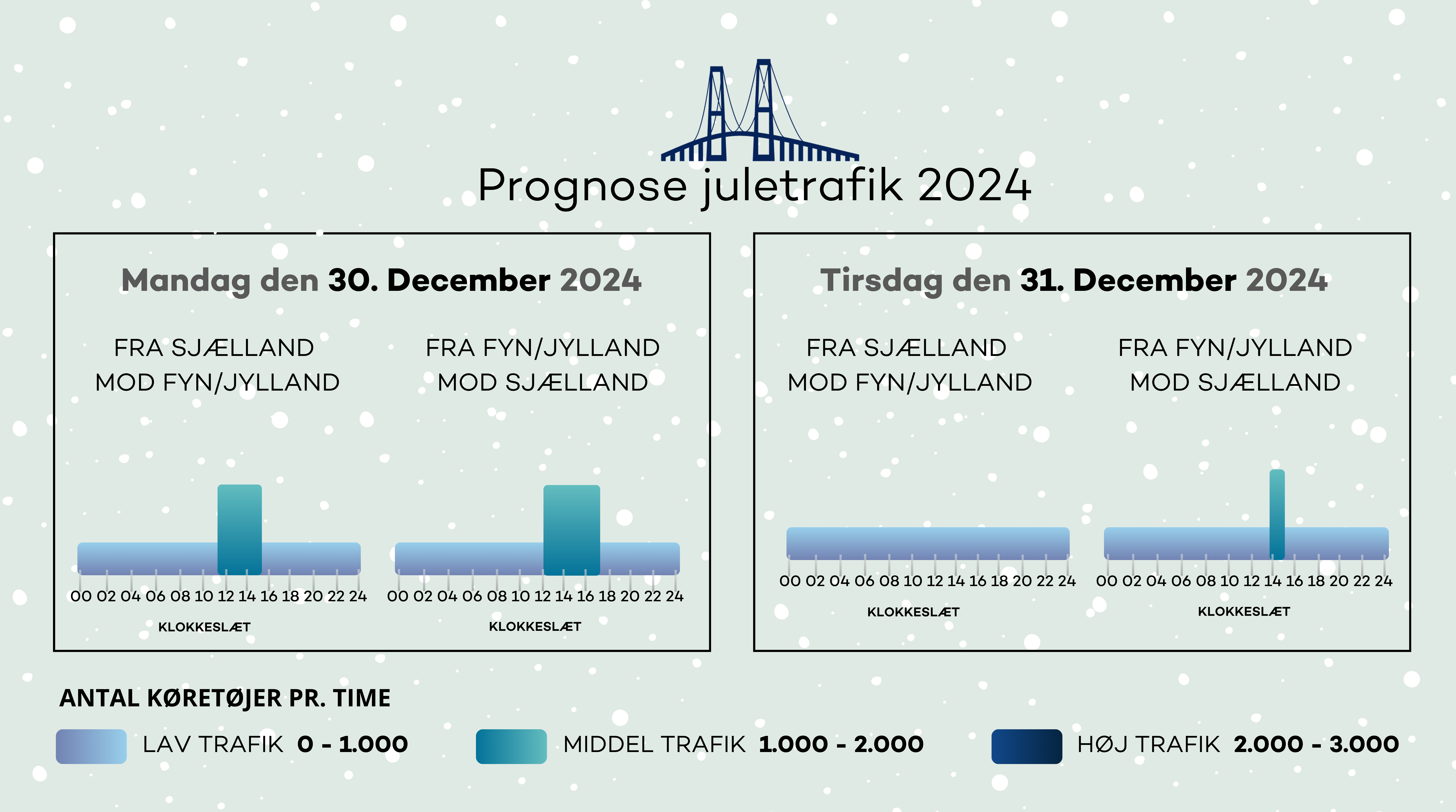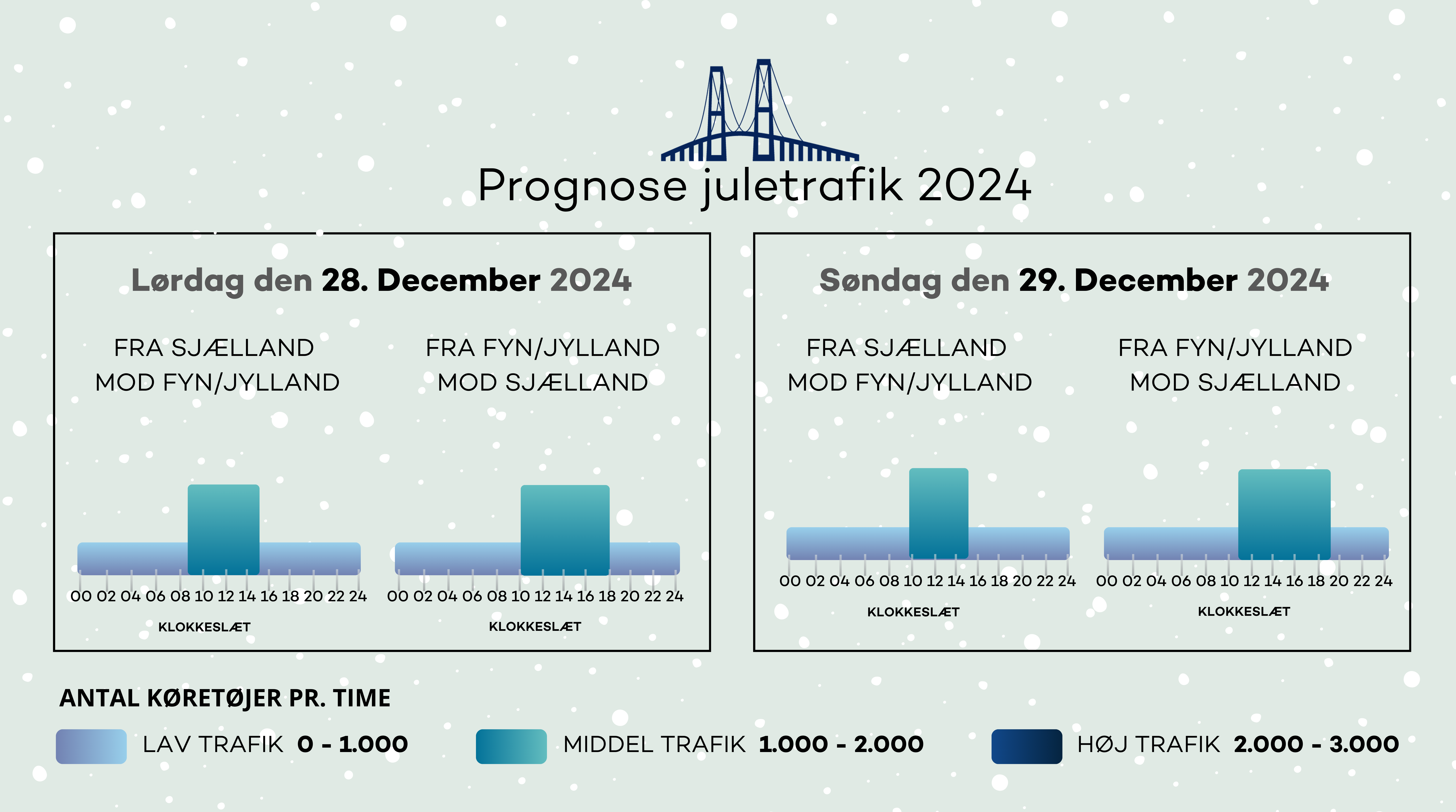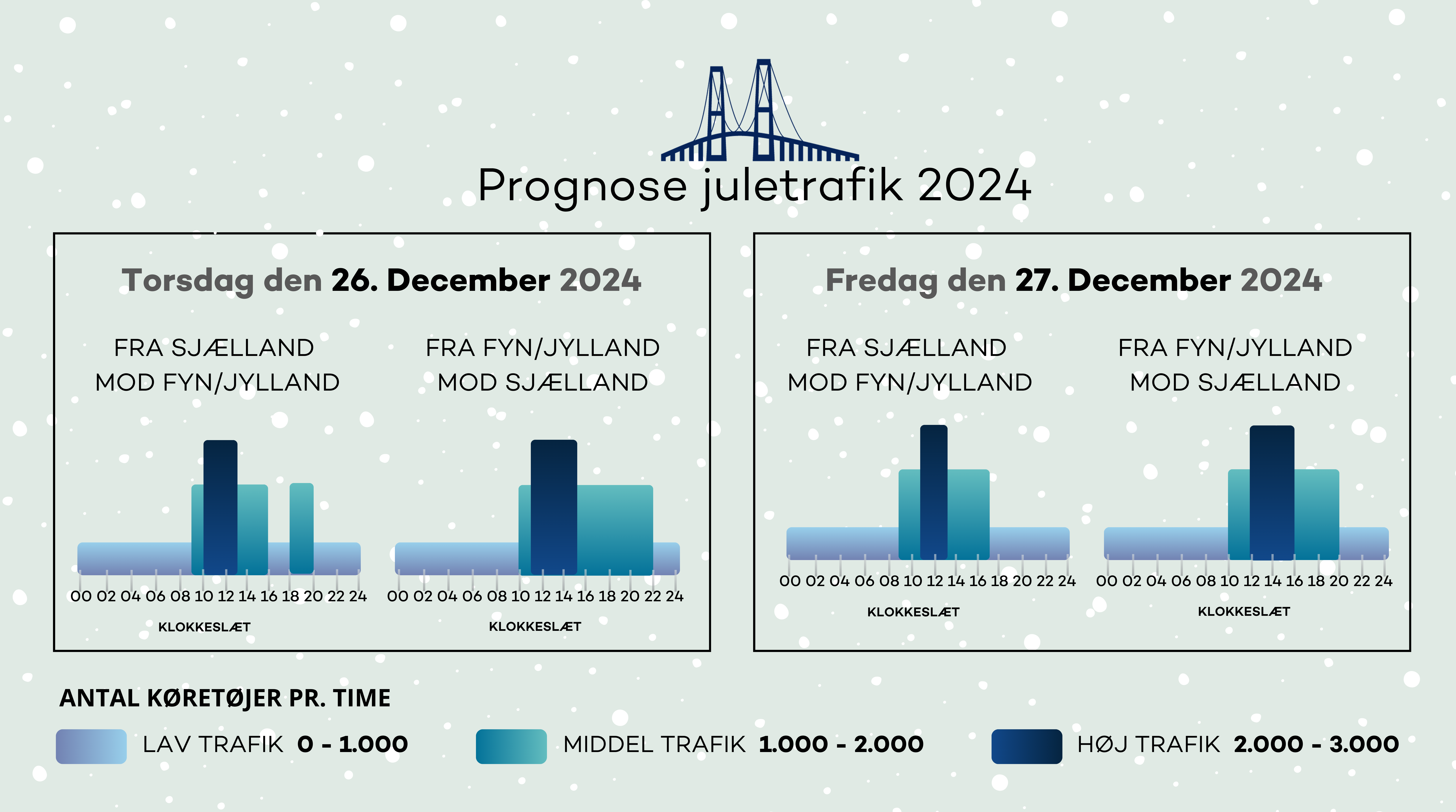 Den travleste rejsedag vil være den 26. december, hvor trafikken forventes at være tættest mellem klokken 10-15. På Storebaelt.dk kan man orientere sig om vejr- og trafikforhold samt finde prognoserne for, hvordan trafikken fordeler sig på de store rejsedage hen over julen.