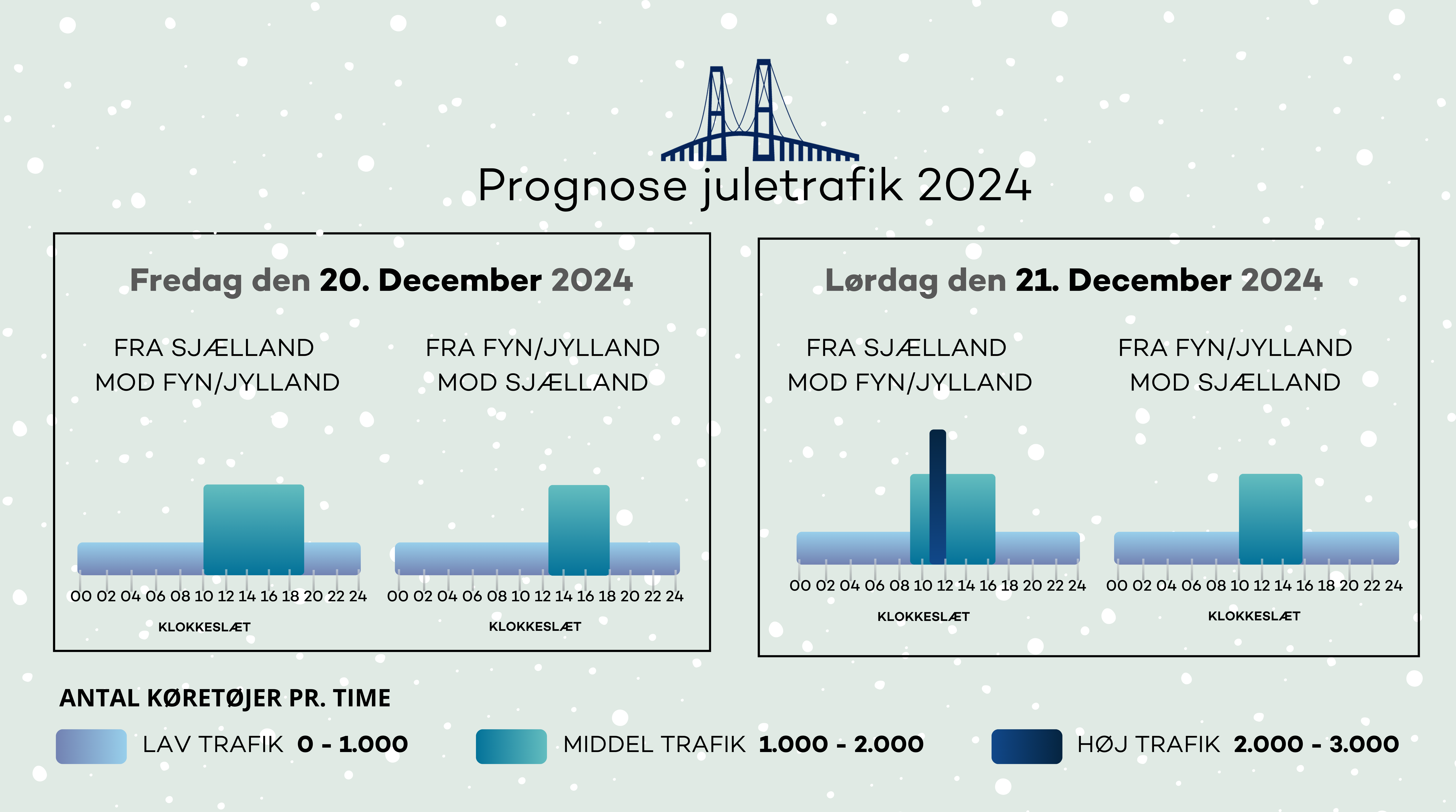 Julen står for døren, og det betyder øget trafik på Storebæltsbroen, når op mod 250.000 trafikanter pakker bilen og krydser landet. I år forventes den 26. december at blive den travleste rejsedag, mens trafikken fordeler sig jævnt i dagene op til juleaften.