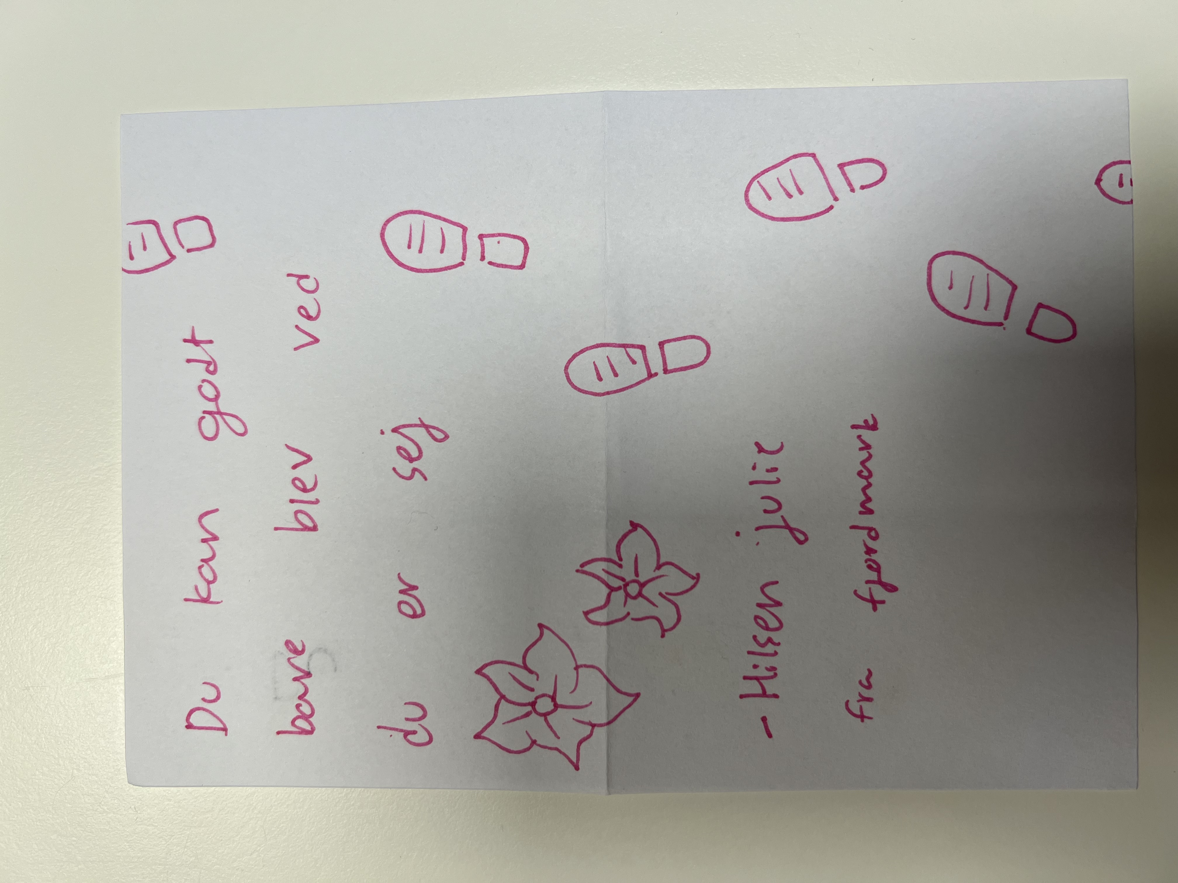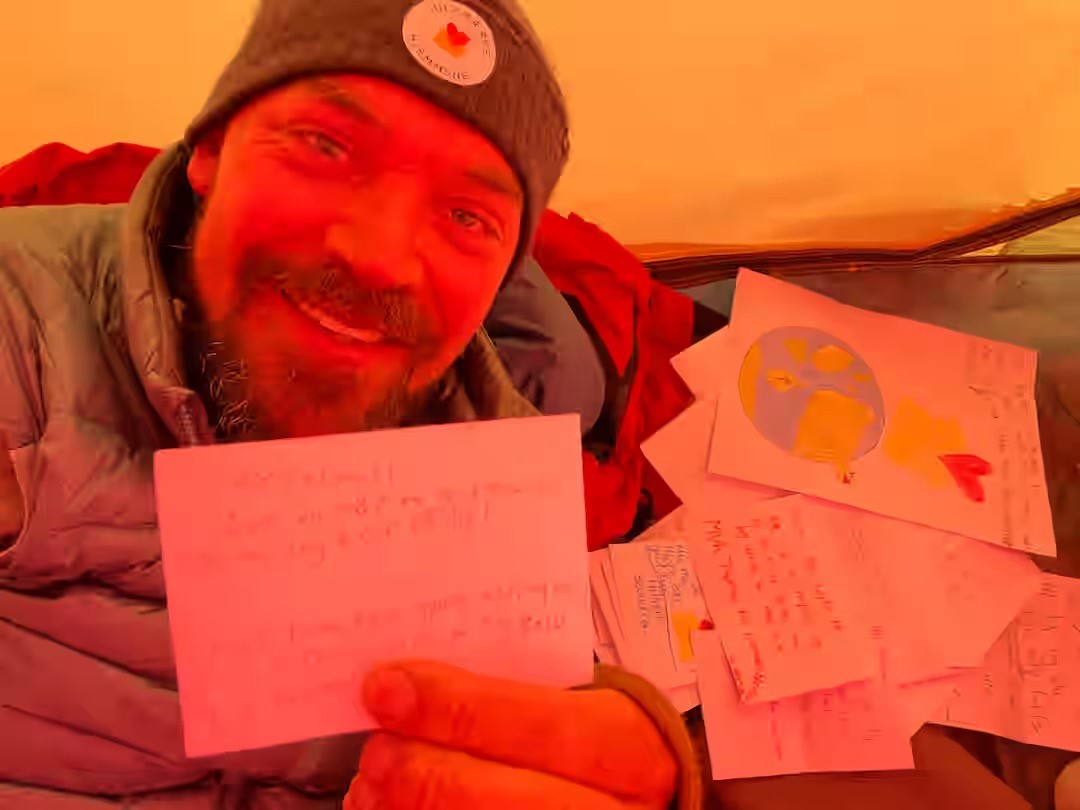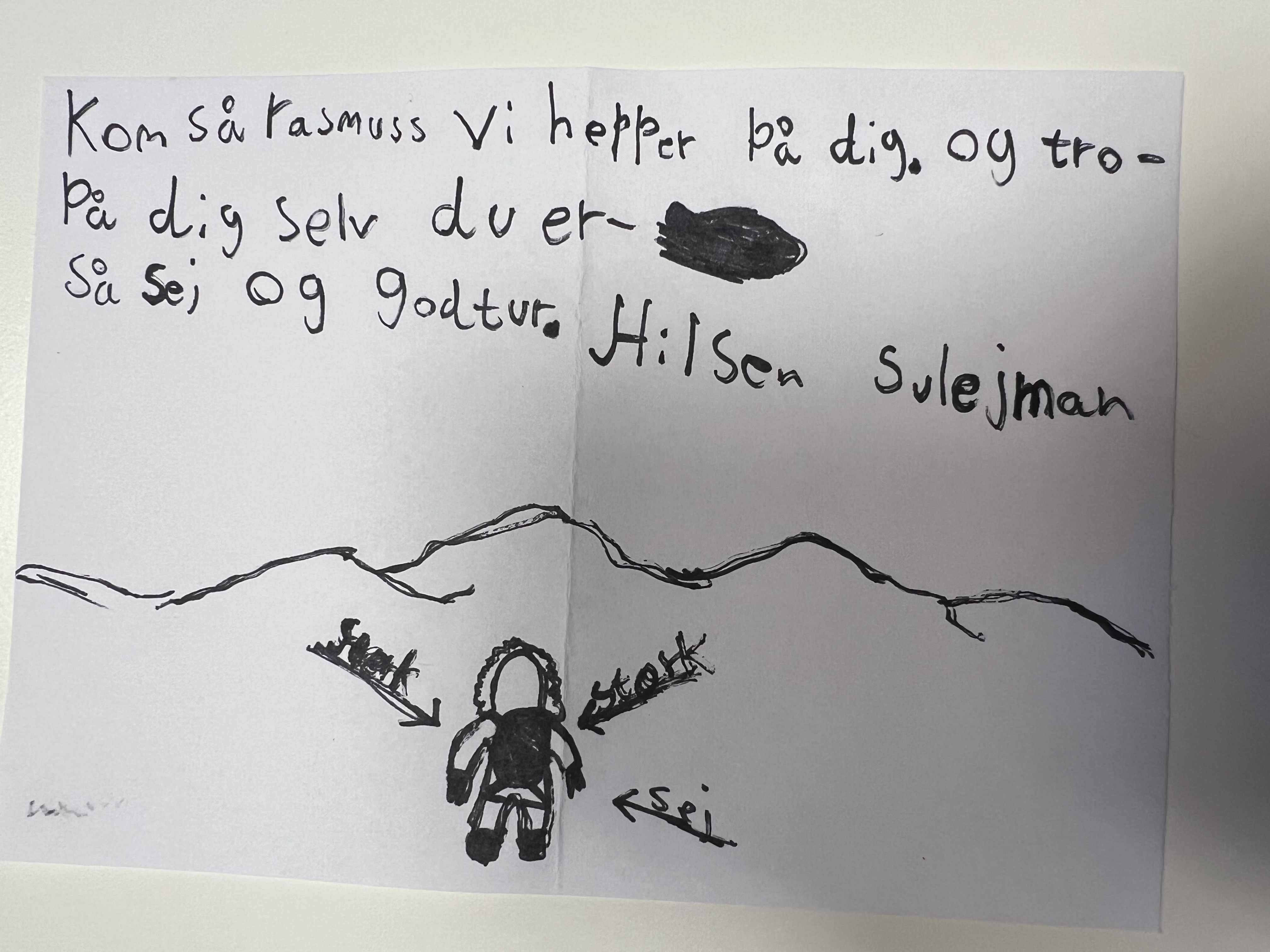 Alligevel er han ikke helt alene. For i sin nøje udvalgte bagage har han en gave i form af julehilsner fra børn på Julemærkehjemmene. Børnene har skrevet opmuntrende beskeder til han, så han kan mærke deres støtte.