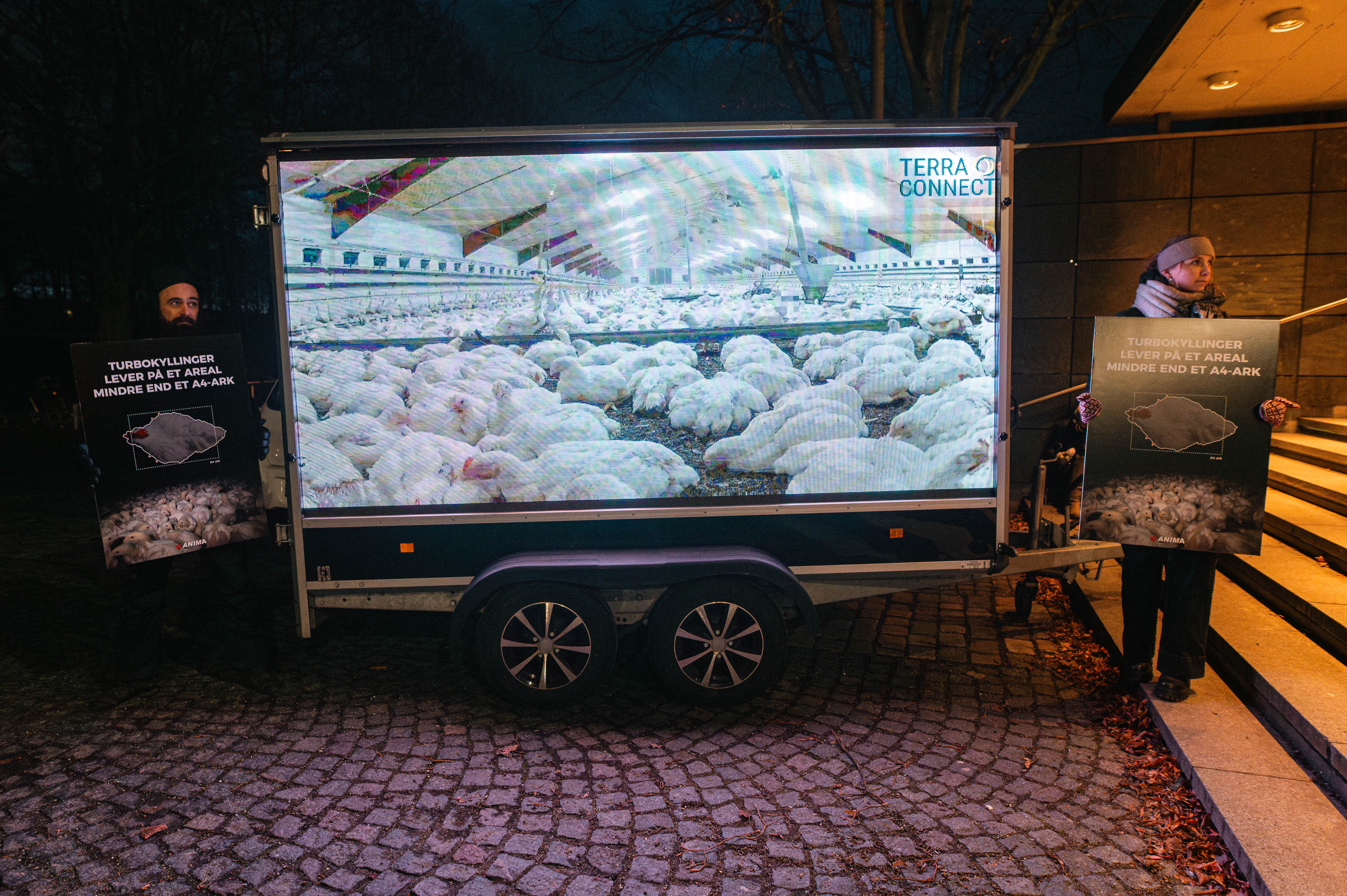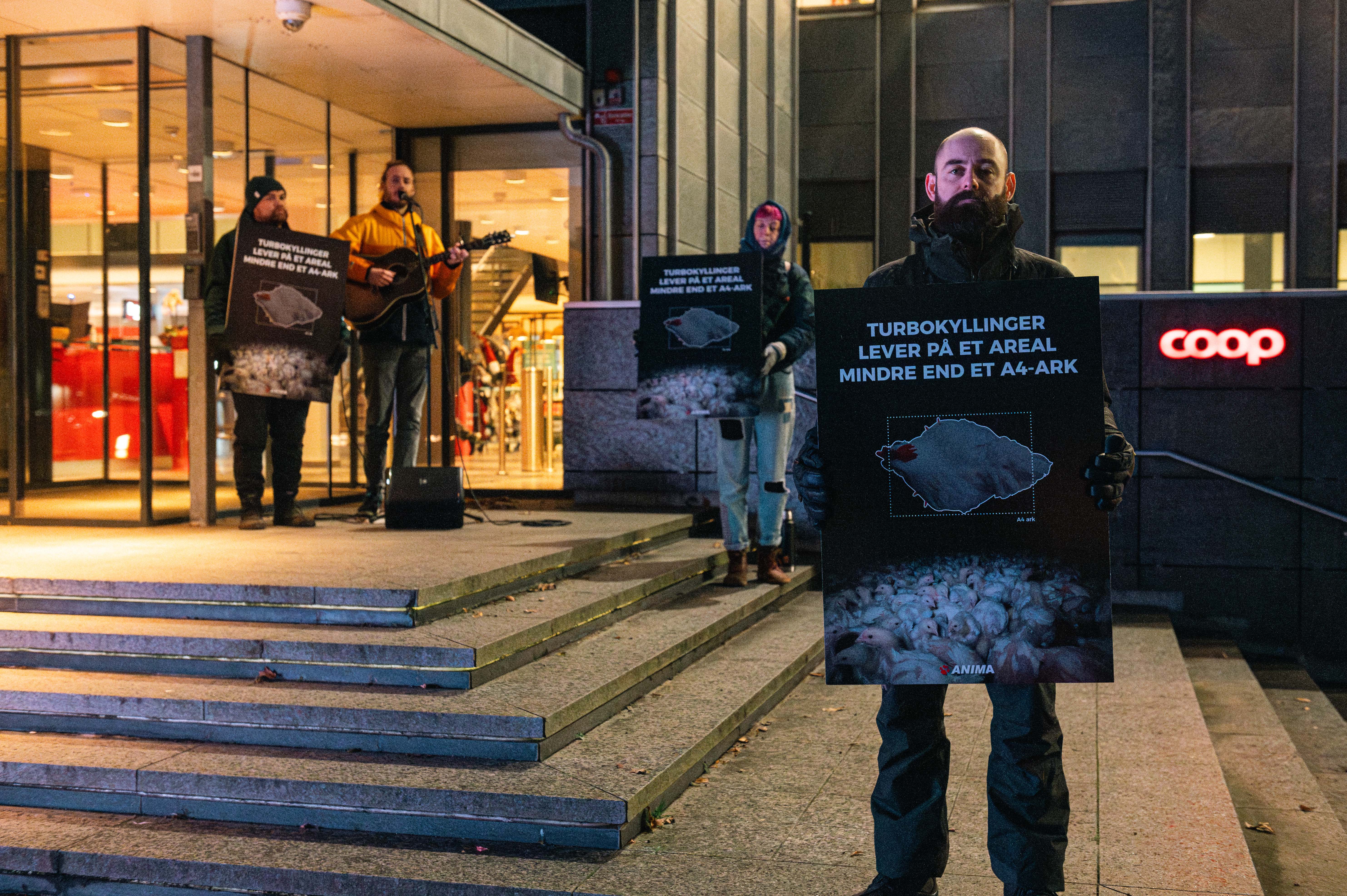 En storskærm med direkte billeder fra en stald med turbokyllinger samt live performance med protest- og nytårssange var synet, der mødte Coops ledelse og mange medarbejdere her til morgen. Det er Anima der står bag aktionen, og formålet er at få Coop til at udfase alle turbokyllinger og indføre bedre pladsforhold i staldene.
