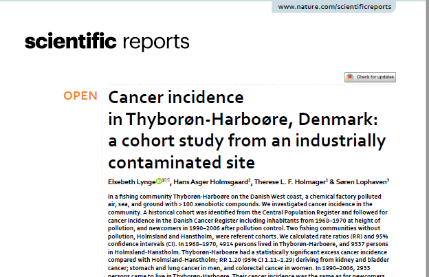 En undersøgelse, som blev offentliggjort i 2021, viste en 20 pct. forøget forekomst af alle kræfttyper sammenlagt hos personer, der boede i Thyborøn-Harboøre i 1968-1970. Mere specifikt var der for både mænd og kvinder omtrent en fordobling af forekomsten af nyre- og blærekræft (i alt 39 tilfælde af nyrecancer og 107 tilfælde af blærecancer).