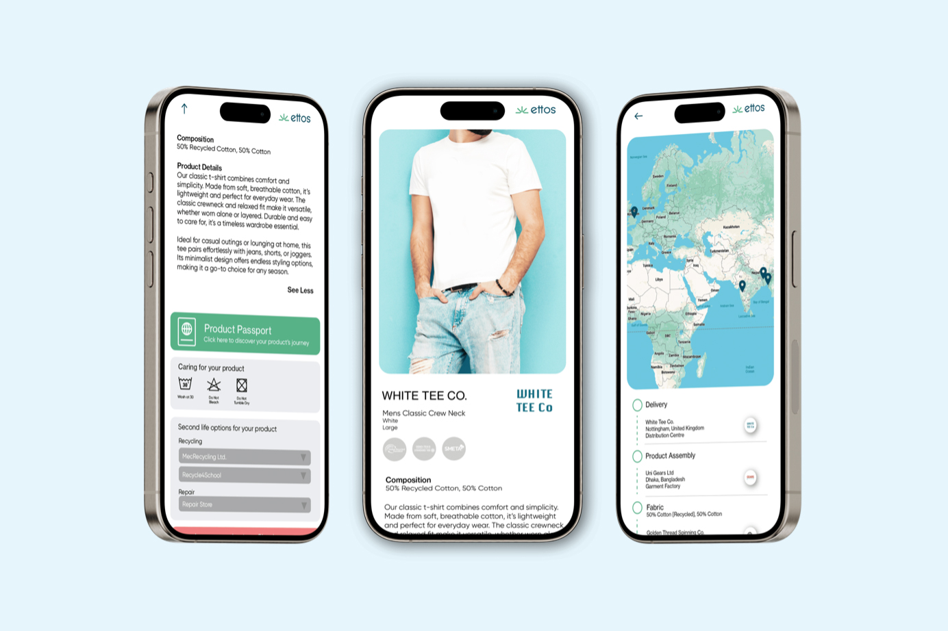 - Digital Product Passports (DPPs) – Accessed via scanning QR codes, ettos’ DPPs allow brands to share extended product profiles, highlight any ethical/environmental accreditations a product may have, share company take-back/recycling schemes and share the products’ supply chain through an interactive map.