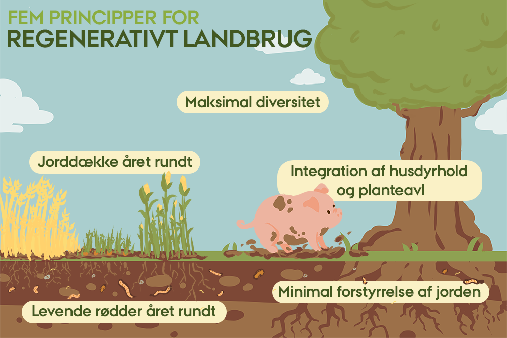 De danske forskeres bud på fem principper læner sig både op ad det amerikanske National Resource Conservation Services’ ”Fire principper for jordsundhed” og Royal Agricultural Society of Englands ”fem principper for regenerativt landbrug”.