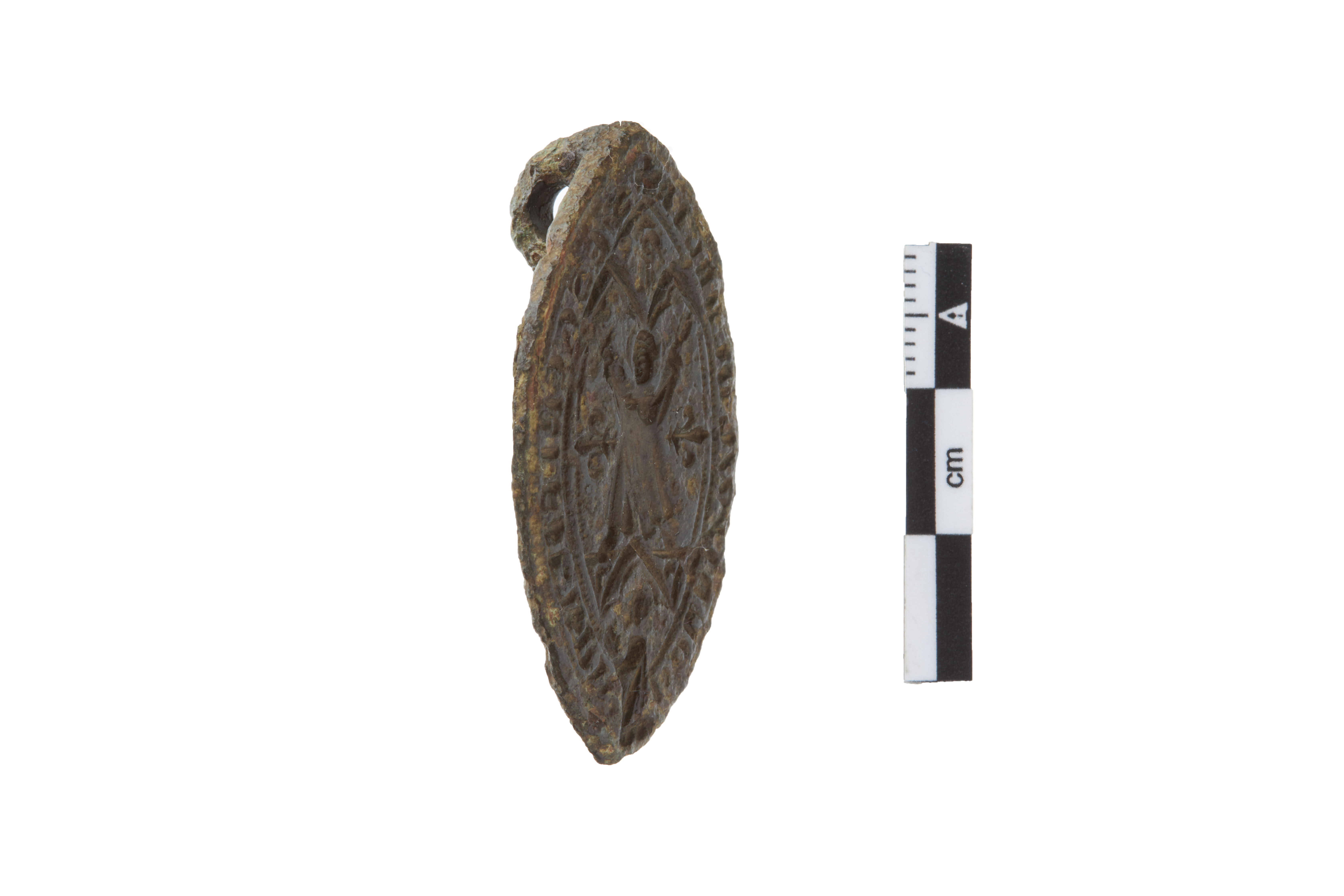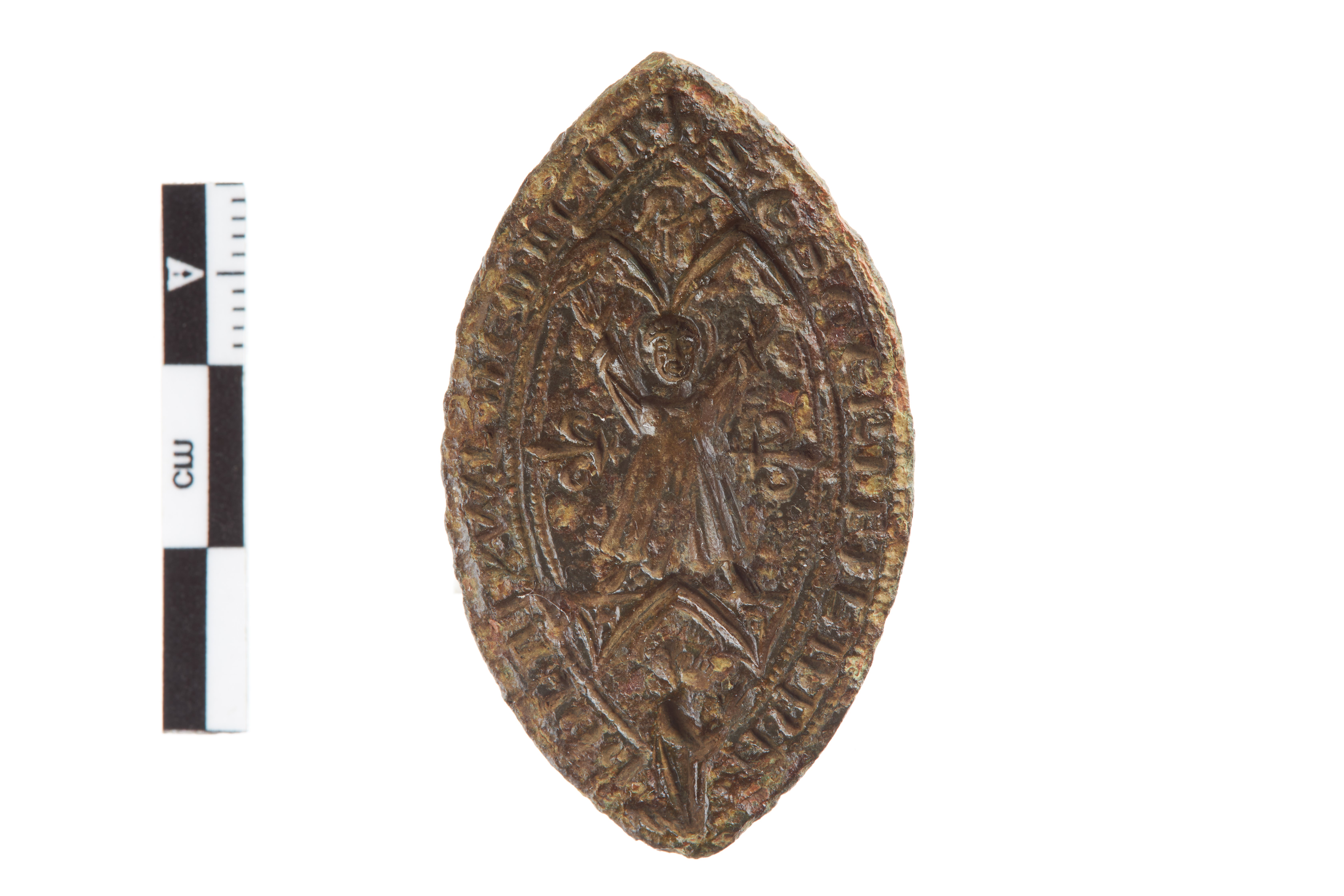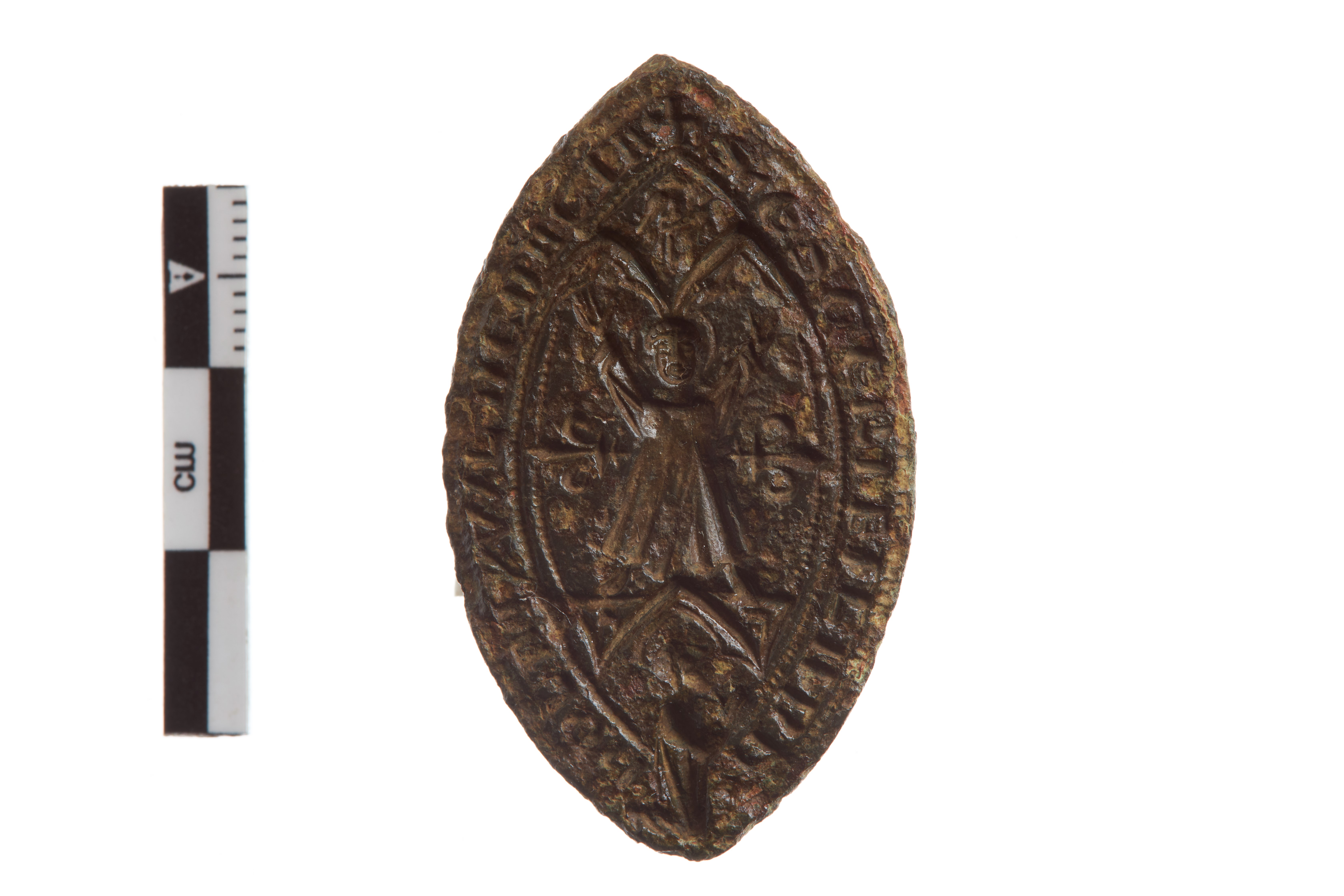 Rettelse: Oprindelig skrev vi, at Frans af Assisi var gengivet midt på seglstampen, men der er sandsynligvis tale om Sankt Andreas, da både hænder og fødder er strakt til siderne, da apostlen blev korsfæstet på et krydsformet kors. Det er rettet i teksten nedenfor.