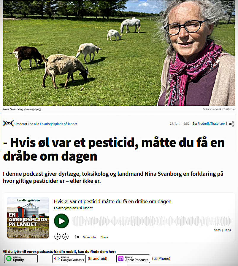 I Landbrugsavisens podcast ”Hvis øl var et pesticid, måtte du få en dråbe om dagen” med undertitlen ”Vild med natur og pesticider - en arbejdsplads på landet” udtaler dyrlæge, landmand og toksikolog Nina Svanborg, at hun ”ikke kan se nogen grund til ikke at bruge pesticider, da de er sikkerhedsmæssigt testede”.