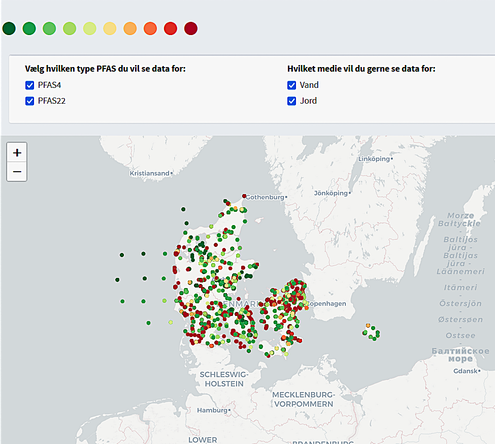 Punkterne på kortet viser hver måling, der er foretaget, og farven på prikkerne indikerer koncentrationen i forhold til grænseværdierne. Grænseværdierne for PFAS4 og PFAS22 er forskellige, ydermere afhænger det af, om der måles i jord eller vand. Punkter markeret med den mørkeste røde farve indikerer, at koncentrationen af PFAS overstiger grænseværdien for den gældende PFAS-type (PFAS4 eller PFAS22) og medie. Den mørkeste grønne farve indikerer nul PFAS i målingen.