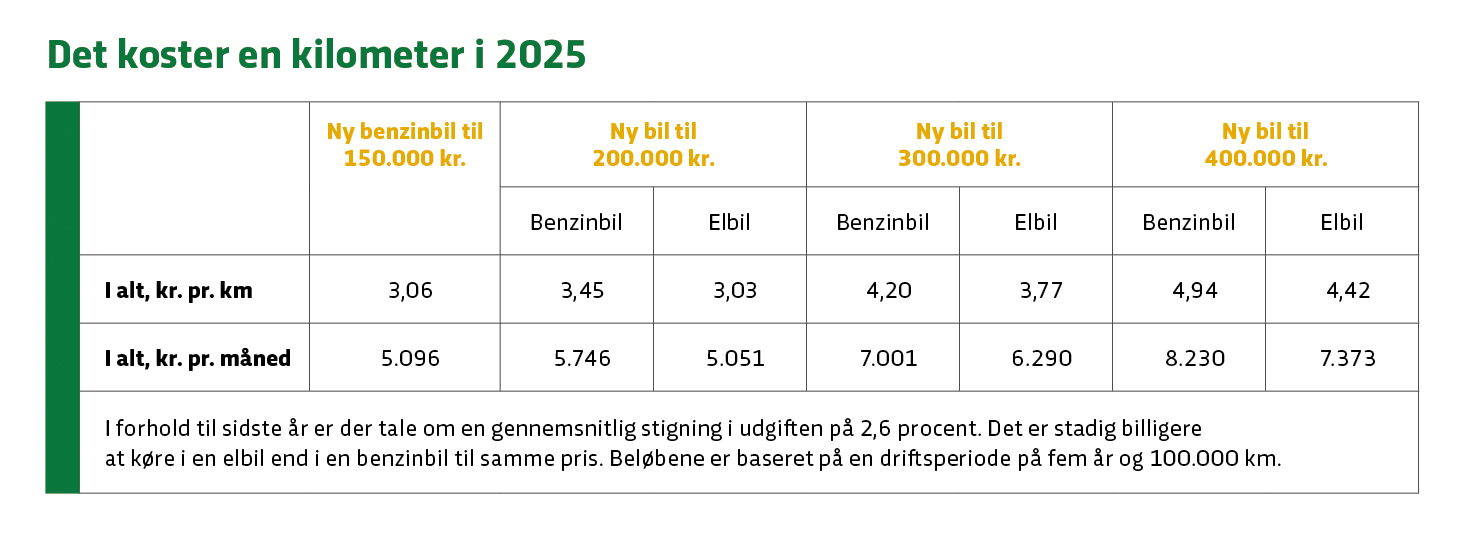 Som tidligere år har FDM beregnet den samlede pris pr. kilometer for biler i forskellige prisklasser, hvis man kører 20.000 km om året og beholder bilen i fem år. I år er der for første gang en elbil til 200.000 kroner med, så man kan sammenligne med benzinbiler i den prisklasse. Derudover er der regnet på både benzin- og elbiler til 300.000 og 400.000 kroner samt benzinbiler til 150.000, da der endnu ikke er elbiler nok i den prisklasse. Til gengæld sælges der nu så få dieselbiler og plugin-hybrider til private, at de ikke er med.