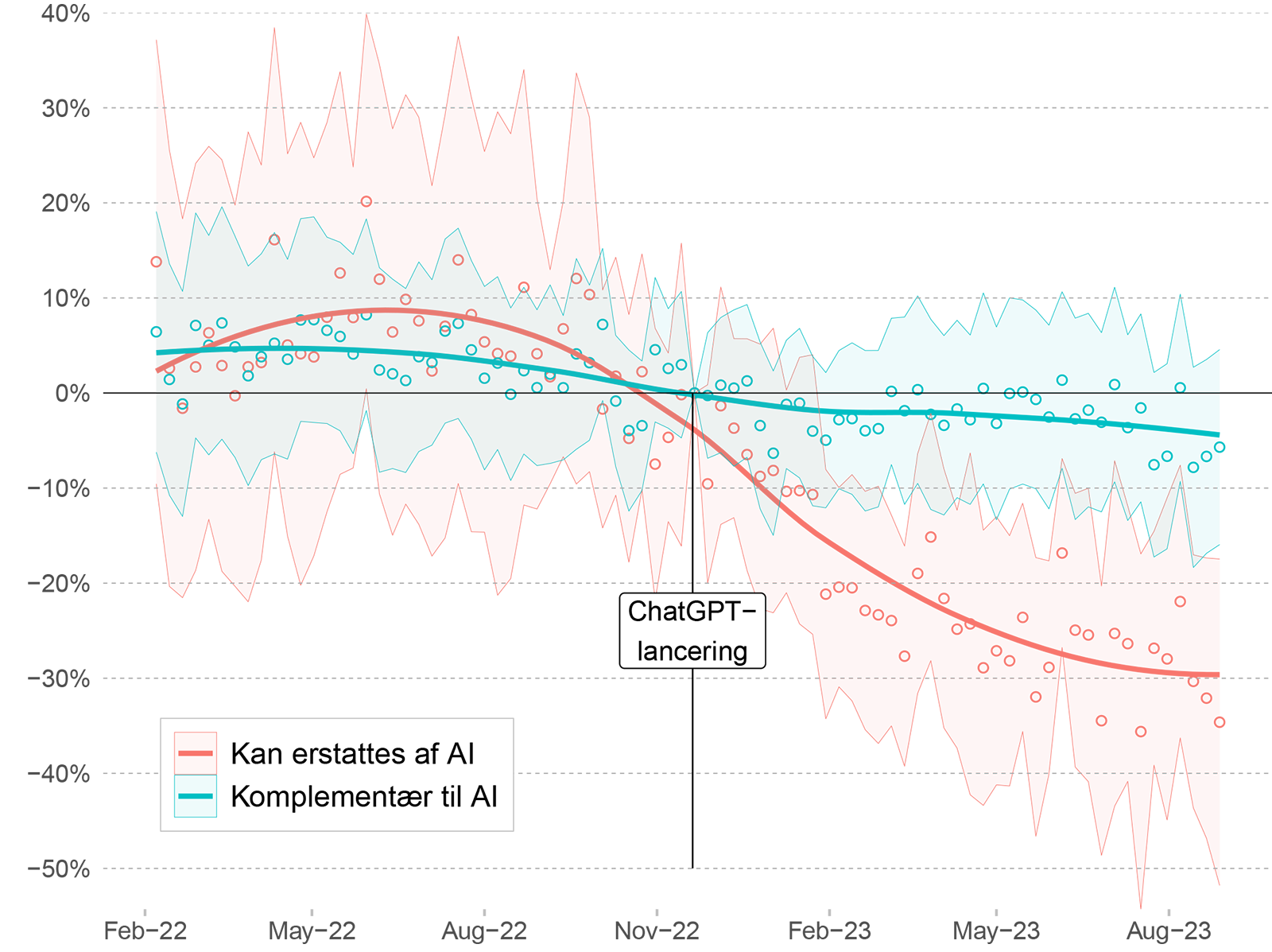 Samlet viser analyserne, at antallet af udbudte freelancejobs inden for områder, som i høj grad kan overtages af ChatGPT, faldt med cirka 24 procent, når man sammenligner med jobtyper, hvor AI blot understøtter arbejdsfunktionen eller slet ikke har nogen betydning.