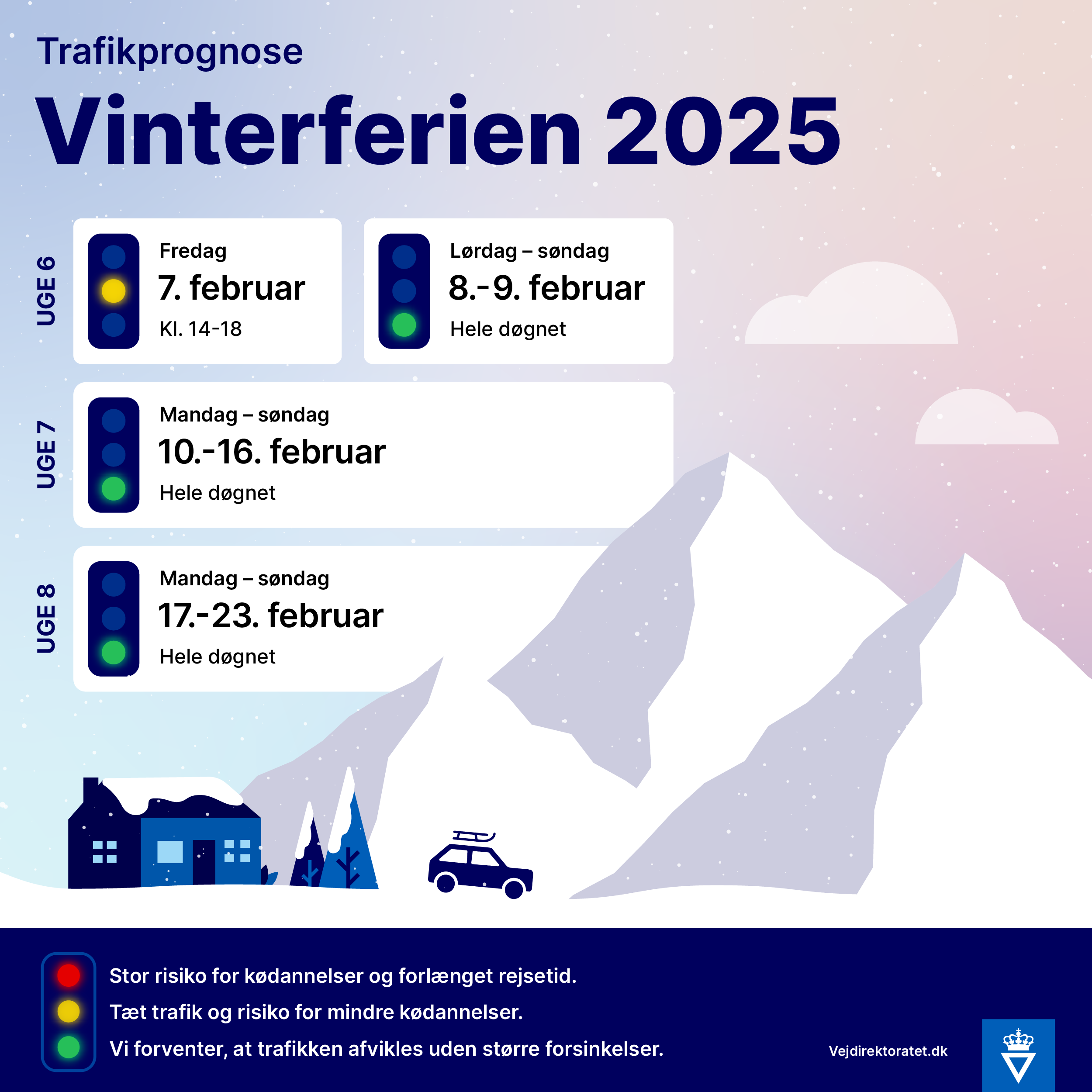 Eneste undtagelse er fredag den 7. februar, hvor den første udrejsetrafik kommer til at blande sig med eftermiddagens myldretidstrafik. Det kan give tæt trafik særligt i retning ud fra de større byer i tidsrummet fra klokken 14.00 til klokken 18.00. Vejdirektoratet anbefaler derfor at køre uden for dette tidsrum.