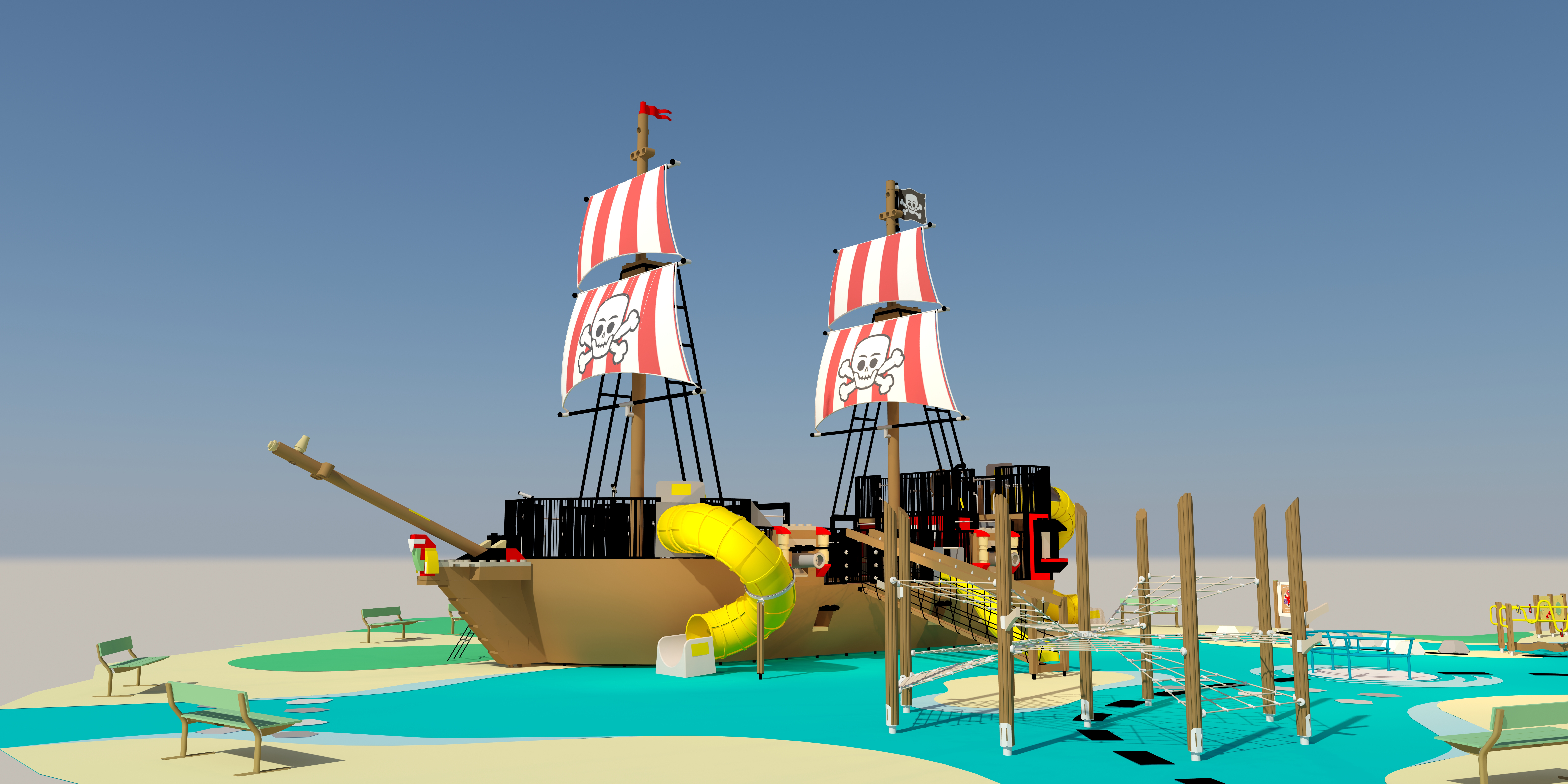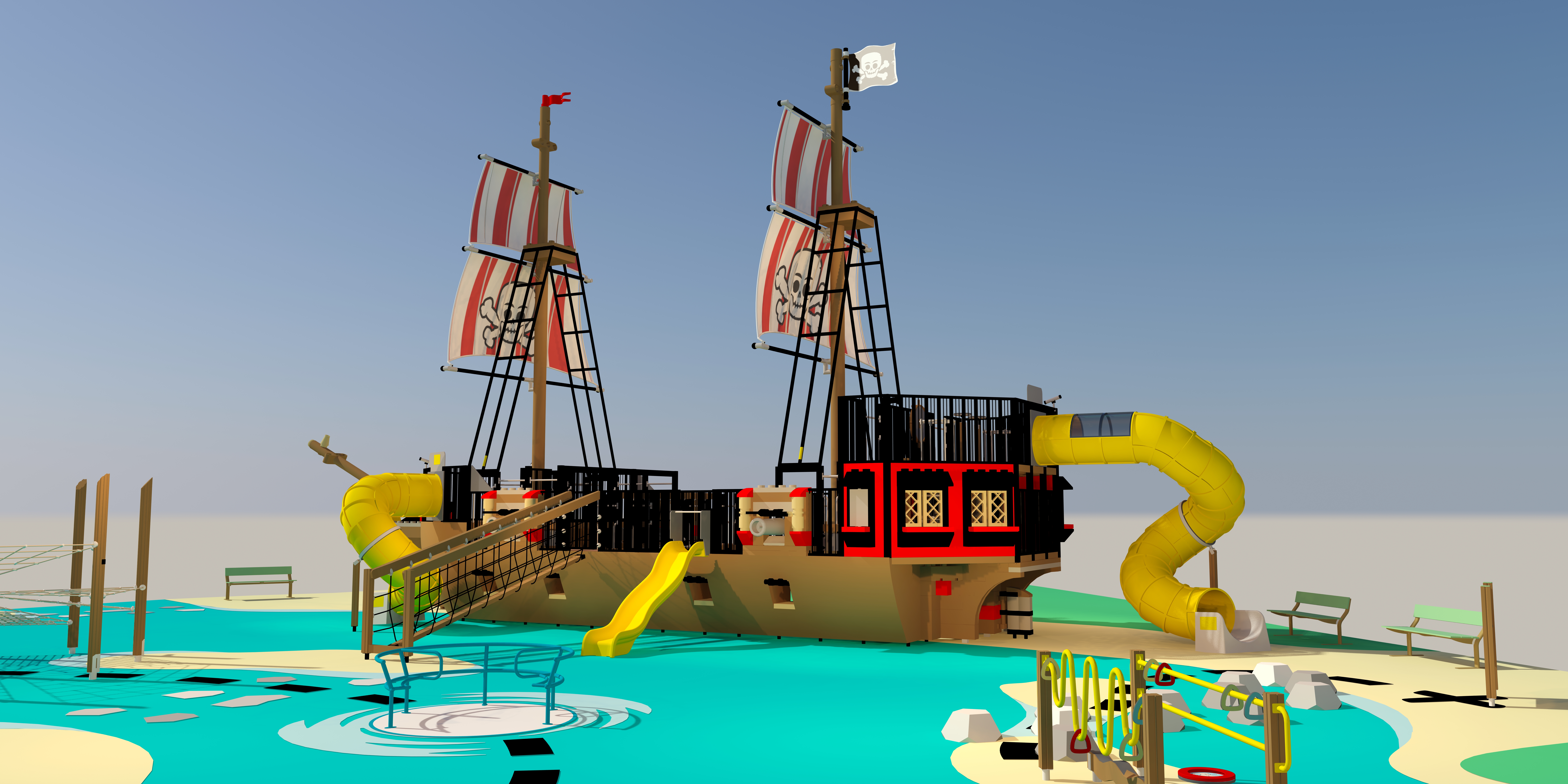 Piratlegepladsens helt store skue er det 21,5 meter lange piratskib med en 11,5 meter høj mast. På skibet kan børnene lege løs på hele tre etager, sigte med kanoner, klatre, rutsje og meget mere. Skibet er ligesom andre dele af legepladsen designet med tanke på tilgængelighed, så det vil være muligt også at gå ombord i en kørestol.