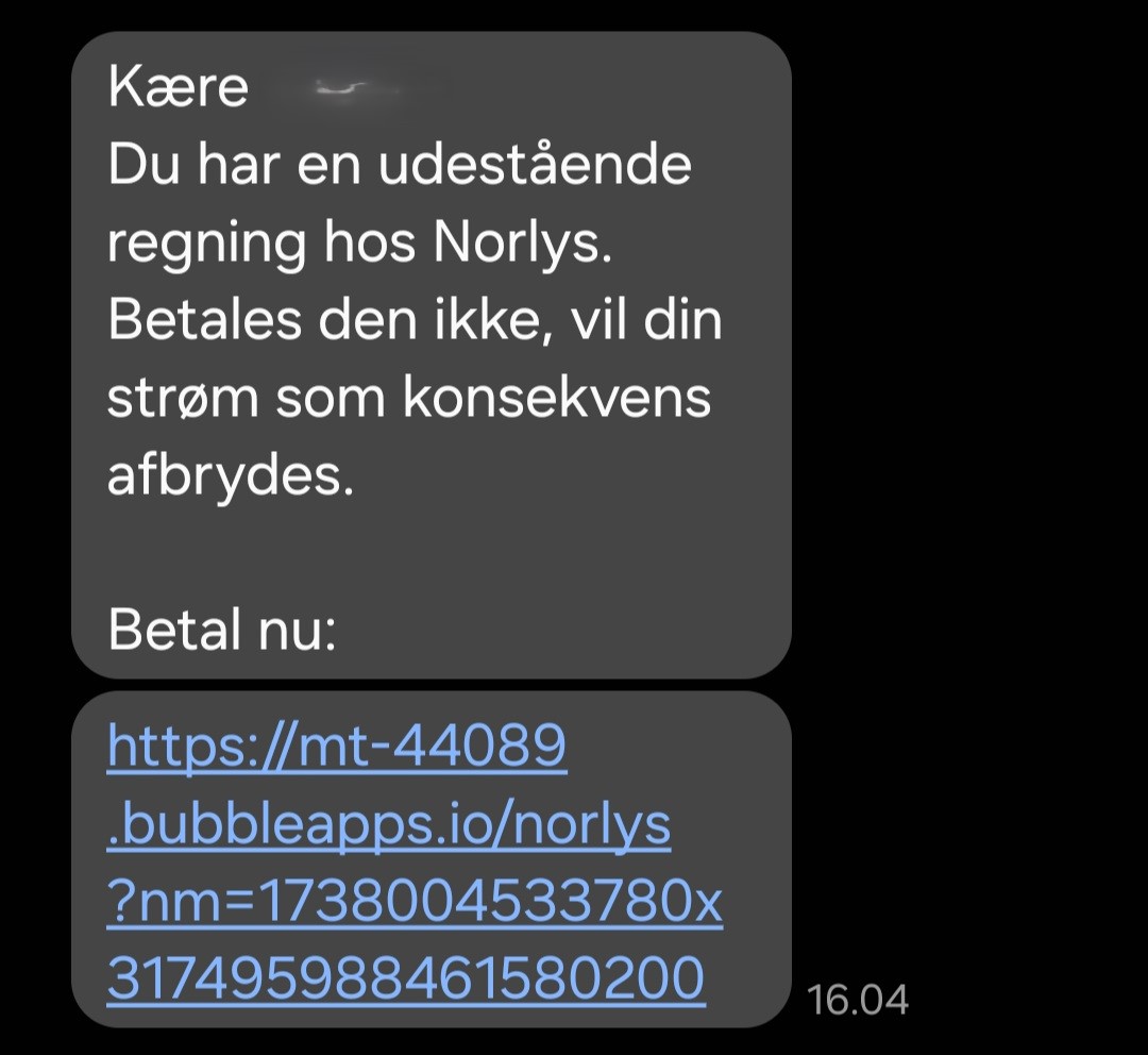 I beskederne står der, at modtageren har en udestående regning, og at Norlys lukker for strømmen, hvis ikke regningen betales. I sms’en er der desuden et link, som modtageren opfordres til at trykke på for at betale regningen. Men sms’erne er falske, og Norlys opfordrer kunder og andre, der har modtaget dem, til at slette sms’erne.